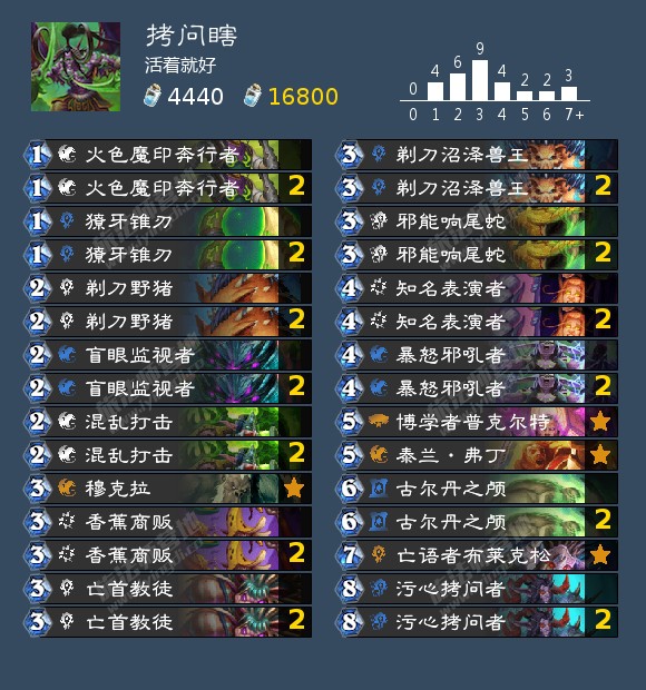 起手留5费的双橙,最好的节奏就是4费下444减费,然后5费博学者牌序,再6费污心者战场。之后就是用随从控场,再用3费的香蕉商贩和穆克拉送对手香蕉就完事了。一个污心者战场一个香蕉就是2成就进度,两个污心者就是4成就进度了。