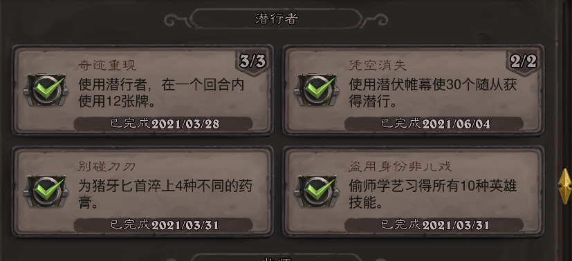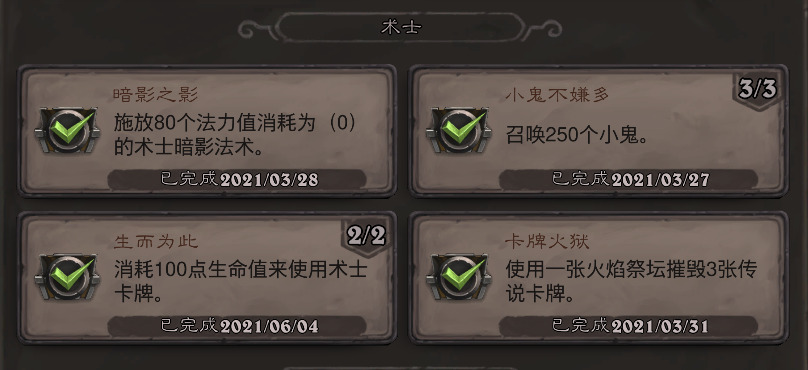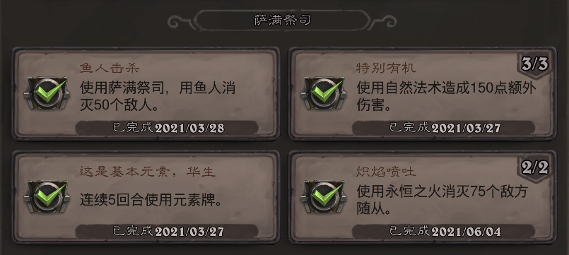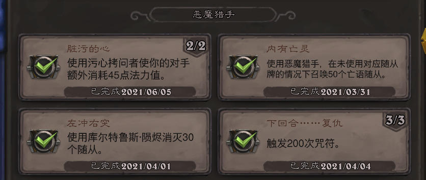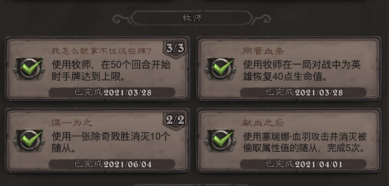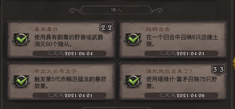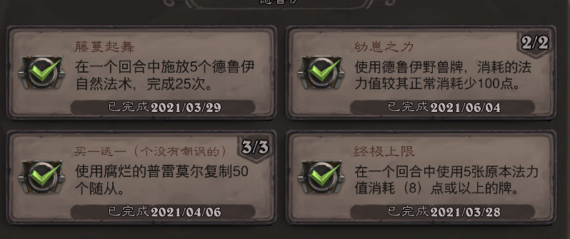 累积性成就都只是时间问题,就是从手牌打出绿色费用的德鲁伊野兽就好了。最常用的就是超凡德,德的高费野兽一大堆,超凡之后都是1费,每次进度加个四五点还是不成问题的。