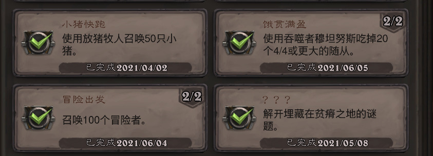 志同道合,使用小队集合召唤4个相同的冒险者,阴间成就,和怀旧成就里总是霍夫一样纯运气卡组,当然如果有py对象一起用周卓对刷的话会快很多,但楼主我没有,所以就没完成。本来楼主我打算100%成就再来发成就攻略的,但想到之前古神在上的成就楼主我是马戏团版本最后一星期才完成的就放弃了。为了能让成就党们能尽快完成,所以楼主我就提前发布攻略了。