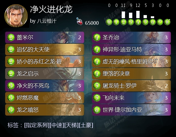 如果能及时通过决意和消失组件断掉对手资源,那么进化龙便可以与对手拼消耗,在后期利用净火的不死鸟等组件赚取大量价值,取得资源优势,进而建立场面优势,最终取胜。尽管这对牌序有不小的要求,但足以使进化龙在面对造物仇和谢幕曲死时获得一战之力。