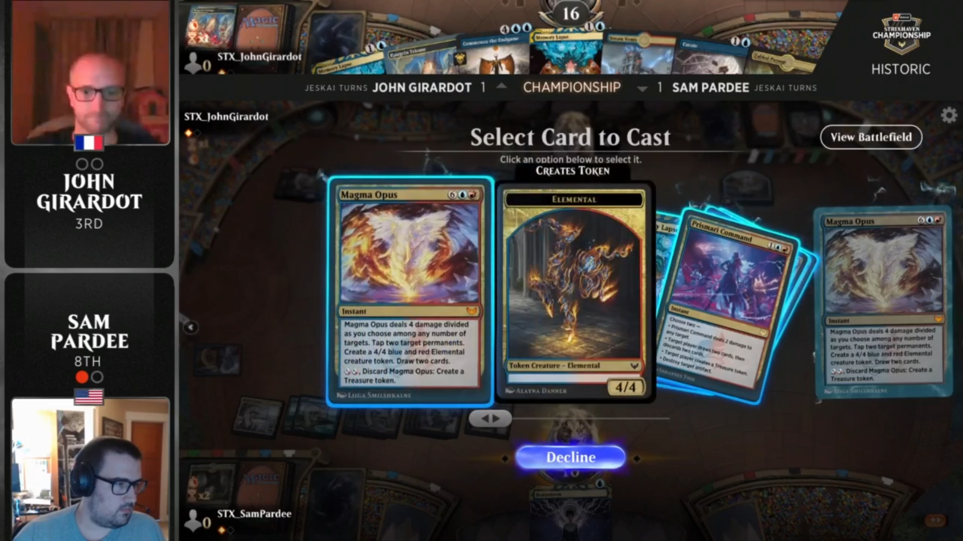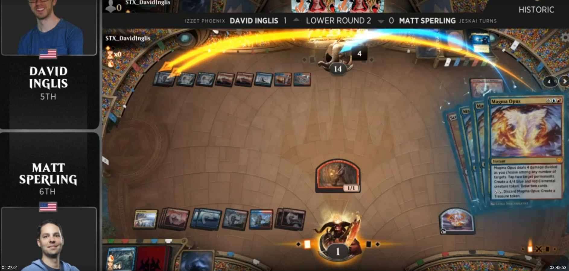 让我们说回冠亚军决赛。几场对局你来我往的互动,Sam Pardee两局都是靠对手几乎tapout做事,抢到了一丝结算咒语的机会,先是在马上被打死的时候拍出维洛马楚衡鉴三连回合,决胜局则是在对手超载米捷兹的精研后,反手也超载精研、返照一个时间弯曲两个至炫熔彩反杀。