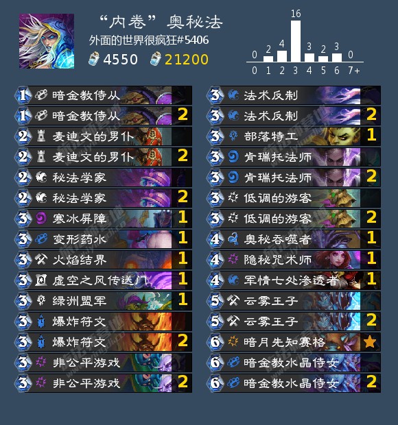 来自外面的世界很疯狂#5406的一套奥秘内卷法,他使用这套卡组从钻石8开打,以30场73.3%的胜率打上传说。这位老哥主战棋,偶尔标狂2选1打打天梯 ,没有太多精力肝排名。哀嚎洞穴让狂野节奏越来越快,能克制窃贼术的卡组自然又是奥秘法。大势所趋,钻石到传说分段的奥秘法数量只多不少。既然狂野天梯全是奥秘法和窃贼术,那我们就来抓这两个职业来上分。