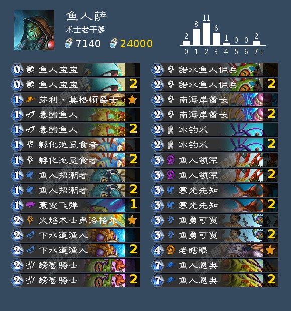 来自营地老哥术士老干爹(战网id阿畅#51979)的一套鱼人萨,他使用这套卡组从钻石10开打,以75%的高胜率到达传说。版本更新后,窃贼术和奥秘法数量暴增。鱼人萨对阵窃贼术是大优,全程仅输一局对手4费启动,其他情况都在启动前打死或打残。有了火焰剧毒组合鱼后,也并不畏惧剑宗。奥秘法是棘手的对局,满编冰钓术和螃蟹骑士,后者4血,搭配剧毒可以吃两个奥秘法随从,一张衰变飞弹能最迅速地解掉疯狂的科学家和对空奥术法师。