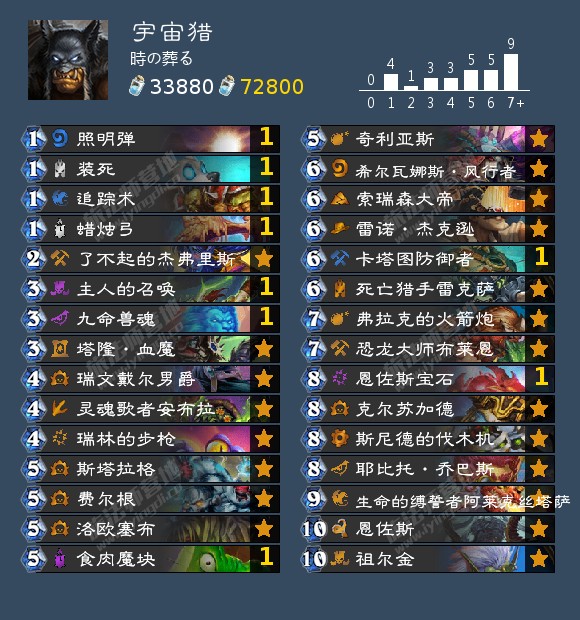 来自b站up時の葬る的一套巨贪宇宙猎,他使用这套卡组在传说分段打出了89场56%胜率,最终定型。这套高曲线卡组的主要粮食是慢速防御型卡组,面对中快速用宇宙周旋,也有胜算。