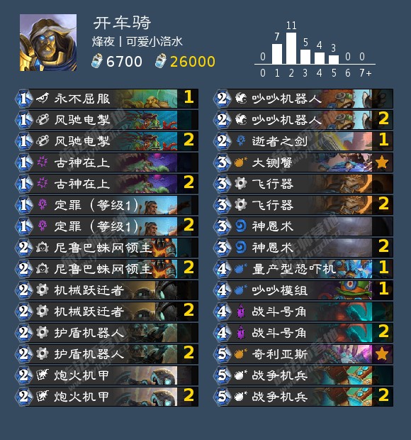 来自烽夜丨可爱小洛水的一套开车骑(文艺复兴-机械污手骑),烽夜丨可爱小疯子使用这套卡组达成11连胜抵达前10并保持70胜率。