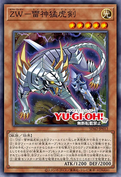 自己的主要阶段时,手卡或者自己场上的这只怪兽可以当作攻击力上升1200的装备卡使用给自己场上的名字带有「希望皇 霍普」的怪兽装备。此外,这张卡当作装备卡使用而装备中的场合,自己场上的名字带有「异热同心武器」的卡不会被对方的卡的效果破坏。装备怪兽被卡的效果破坏的场合,作为代替把这张卡破坏。「异热同心武器-雷神猛虎剑」在自己场上只能有1张表侧表示存在。