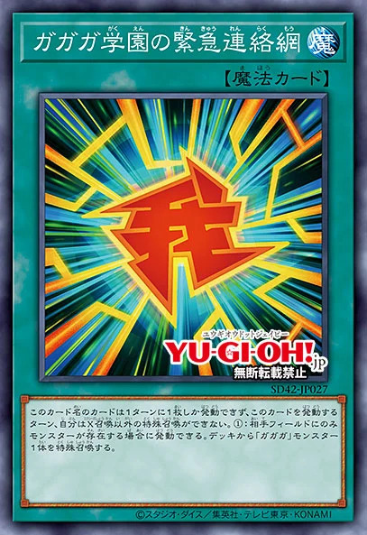 对方场上有怪兽存在,自己场上没有怪兽存在的场合才能发动。从卡组把1只名字带有「我我我」的怪兽特殊召唤。这张卡发动的回合,自己不能作超量召唤以外的特殊召唤。「我我我学园的紧急联络网」在1回合只能发动1张。