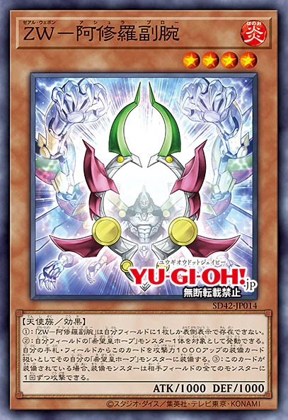 自己的主要阶段时,手卡或者自己场上的这只怪兽可以当作攻击力上升1000的装备卡使用给自己场上的名字带有「希望皇 霍普」的怪兽装备。装备怪兽可以向对方场上的全部怪兽各作1次攻击。「异热同心武器-阿修罗副腕」在自己场上只能有1张表侧表示存在。