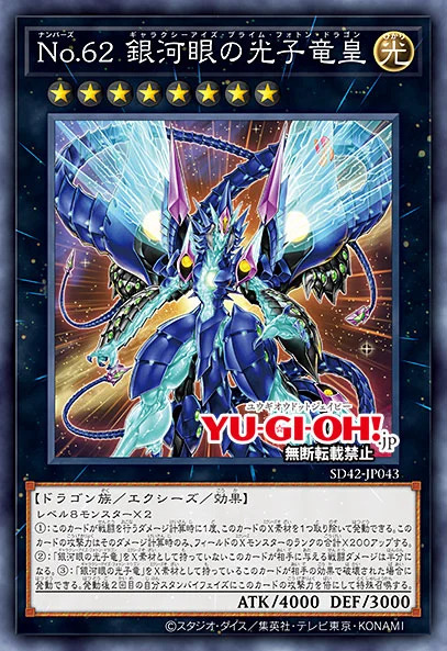 ①:这张卡进行战斗的伤害计算时1次,把这张卡1个超量素材取除才能发动。这张卡的攻击力只在那次伤害计算时上升场上的超量怪兽的阶级合计×200。②:没持有「银河眼光子龙」作为超量素材的这张卡给与对方的战斗伤害变成一半。③:持有「银河眼光子龙」作为超量素材的这张卡被对方的效果破坏的场合才能发动。发动后第2次的自己准备阶段把这张卡的攻击力变成2倍特殊召唤。