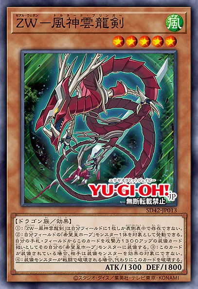 自己的主要阶段时,手卡或者自己场上的这只怪兽可以当作攻击力上升1300的装备卡使用给自己场上的名字带有「希望皇 霍普」的怪兽装备。此外,这张卡当作装备卡使用而装备中的场合,对方不能把装备怪兽作为卡的效果的对象。装备怪兽被战斗破坏的场合,作为代替把这张卡破坏。「异热同心武器-风神云龙剑」在自己场上只能有1张表侧表示存在。
