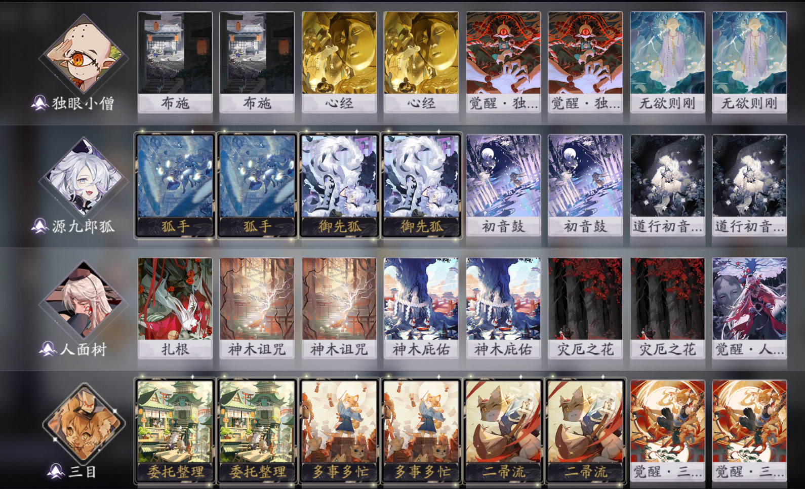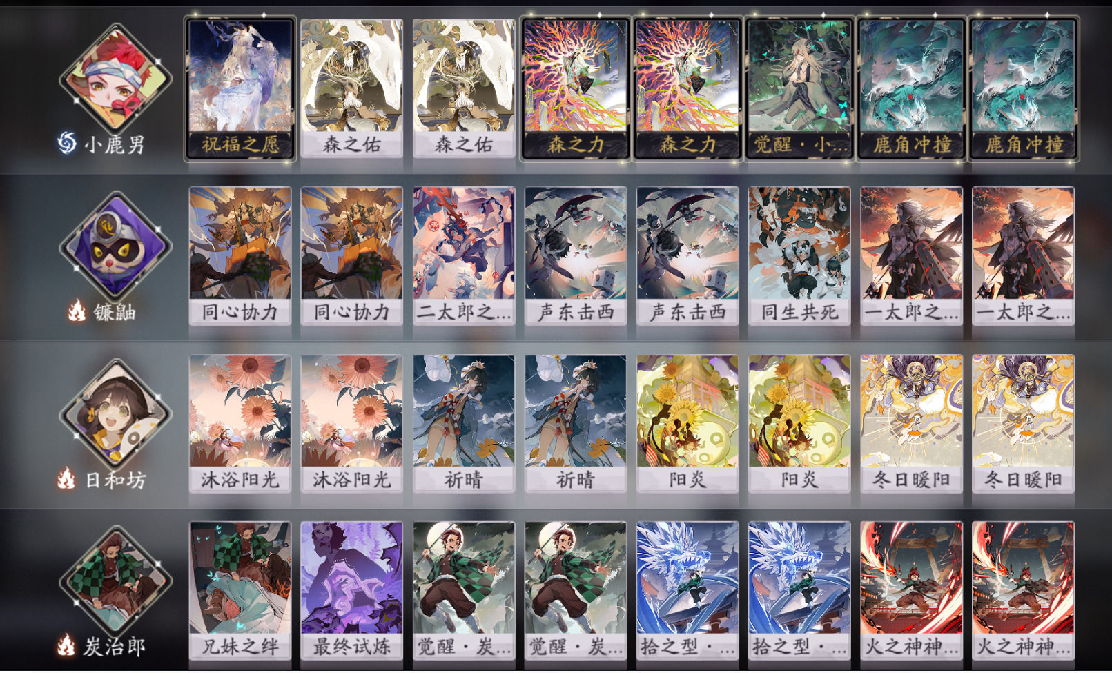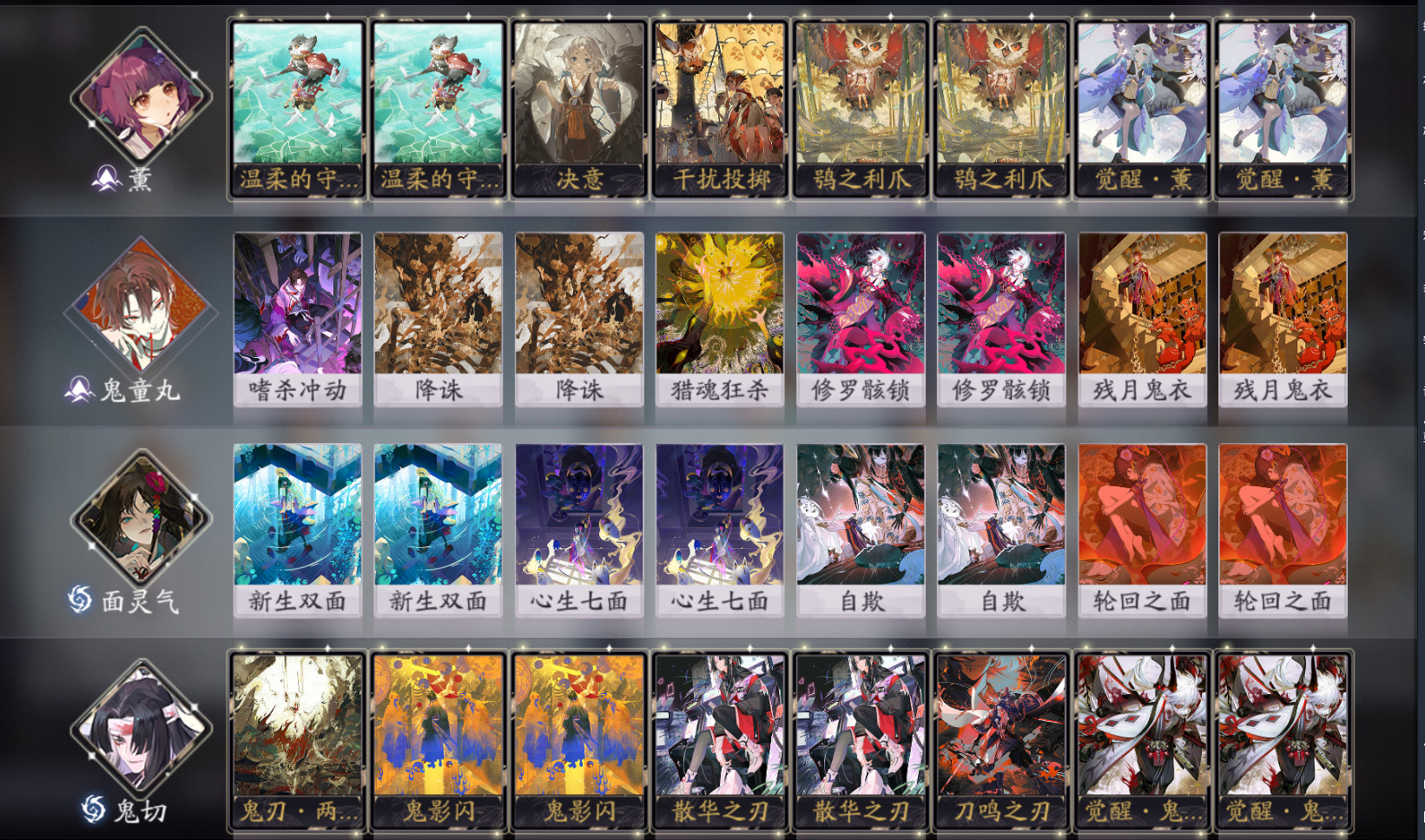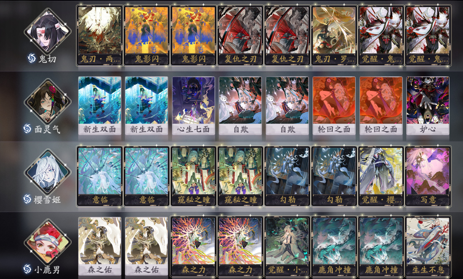阵容名: 鬼切 鬼刃·罗城门 (1) 复仇之刃 (2) 觉醒·鬼切 (2) 鬼刃·两断 (1) 鬼影闪 (2) 面灵气 妒心 (1) 新生双面 (2) 心生七面 (1) 自欺 (2) 轮回之面 (2) 樱雪姬 觉醒·樱雪姬 (1) 写意 (1) 意临 (2) 窥秘之瞳 (2) 勾勒 (2) 小鹿男 鹿角冲撞 (2) 生生不息 (1) 觉醒·小鹿男 (1) 森之佑 (2) 森之力 (2) 阵容码:Ml8xMDFfNDg3NjUxNV8xNjIzMTUwNzg2fHp4AAACAAAAIUUBAAZFAQAJRQEAEkUBABpFAQDK/gAAzf4AANH+AAC6/gAAvv4AAIlDAQCNQwEAdkMBAHpDAQB+QwEAhSoBAIoqAQCOKgEAdSoBAHoqAQA= 如果想要使用此阵容,可将阵容码复制到剪贴板,然后在“新建阵容”里点击“使用阵容码”进行粘贴。