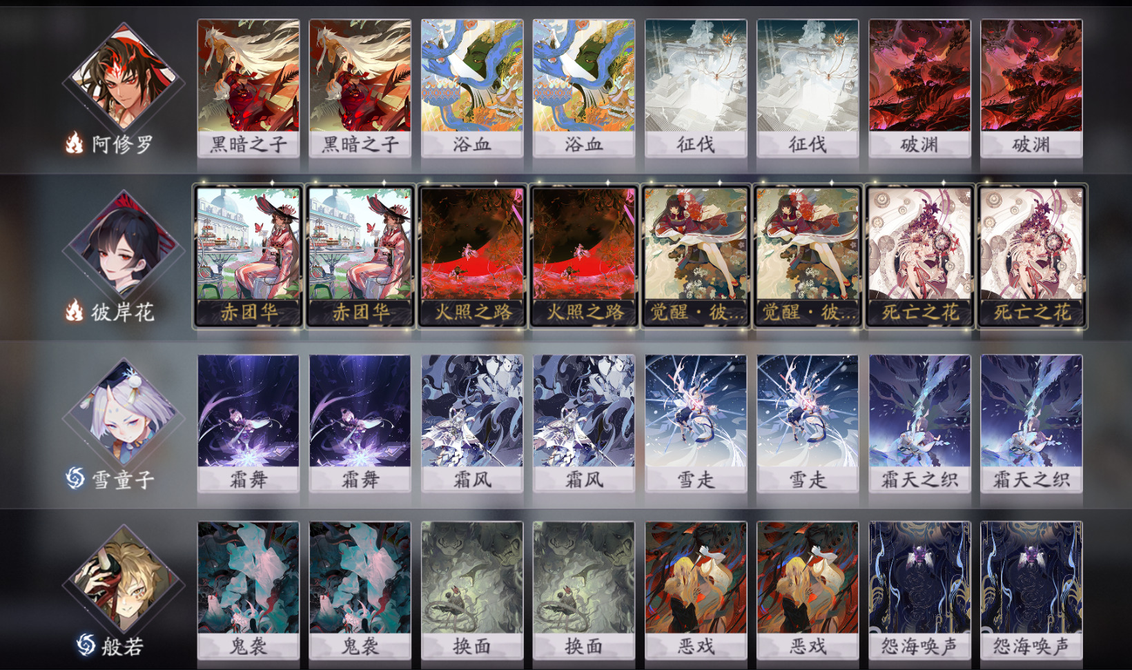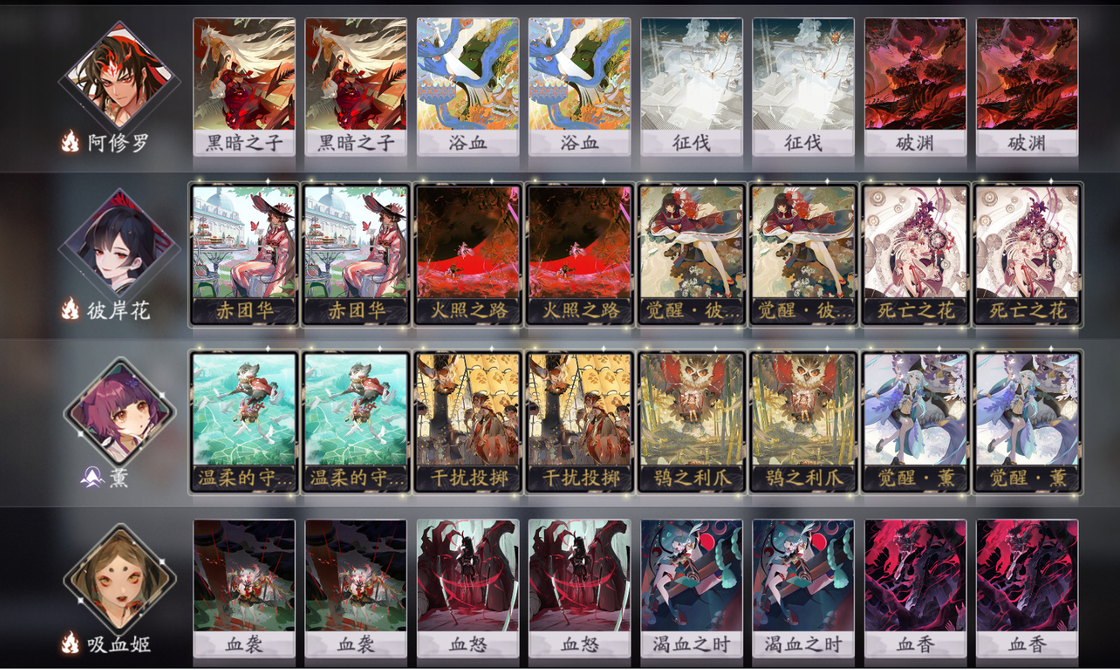 阵容名: 阿修罗 黑暗之子 (2) 征伐 (2) 浴血 (2) 破渊 (2) 彼岸花 死亡之花 (2) 赤团华 (2) 火照之路 (2) 觉醒·彼岸花 (2) 雪童子 雪走 (2) 霜舞 (2) 霜天之织 (2) 霜风 (2) 般若 恶戏 (2) 鬼袭 (2) 换面 (2) 怨海唤声 (2) 阵容码:Ml8xMDFfNDg3NjUxNV8xNjIzMTU2NjQyfHp4AAACAAAABl4BAApeAQAOXgEAFl4BAAavAAAKrwAAFq8AAB6vAADCCQEAqgkBALYJAQC6CQEABlABAPZPAQD6TwEA/k8BAA== 异画:engAAGnxGQA= 如果想要使用此阵容,可将阵容码复制到剪贴板,然后在“新建阵容”里点击“使用阵容码”进行粘贴。