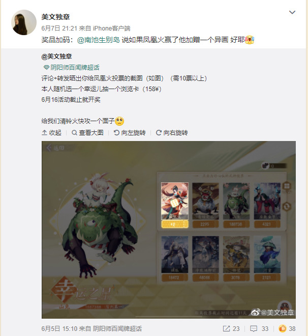 美文独章和她的徒弟,在百闻牌六六运势祭开始的第一天,美文独章就加入了支持凤凰火异画的队伍当中。虽然凤凰火目前与第一名山兔还有很大的差距,但是三轮比赛的赛制不到最后一刻又怎能见分晓呢。可能是之前崽战时桃花妖的逆袭激励了她,美文独章在她的个人微博还进行了抽奖为凤凰火造势,同样她的徒弟也跟随师父一起在B站的个人账号发布了支持凤凰火的抽奖信息,想去碰碰运气的朋友不妨去看看,顺便投上凤凰火一票吧。(我想看不一样颜色的火焰!)