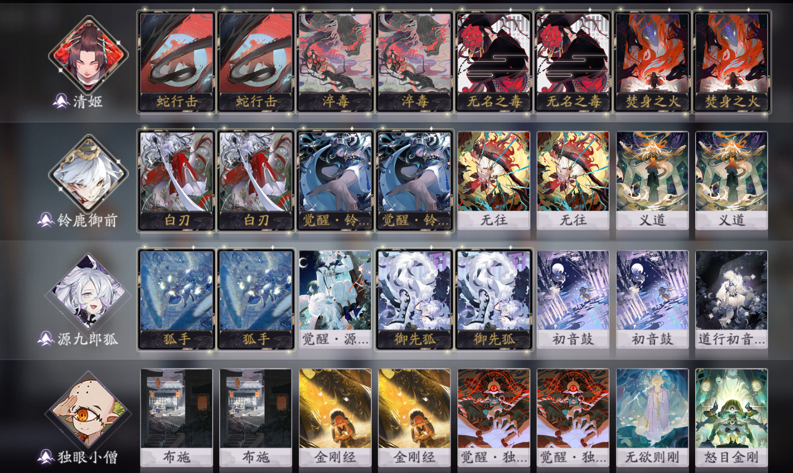 阵容名: 清姬 无名之毒 (2) 焚身之火 (2) 蛇行击 (2) 淬毒 (2) 铃鹿御前 义道 (2) 白刃 (2) 觉醒·铃鹿御前 (2) 无往 (2) 源九郎狐 御先狐 (2) 初音鼓 (2) 觉醒·源九郎狐 (1) 狐手 (2) 道行初音旅 (1) 独眼小僧 怒目金刚 (1) 布施 (2) 金刚经 (2) 觉醒·独眼小僧 (2) 无欲则刚 (1) 阵容码:Ml8xMDFfNDg3NjUxNV8xNjIzMTU2NTMyfHp4AAACAAAAYhkBAEYZAQDOGQEAWhkBAMKzAADGswAAtrMAALqzAADhJQEAxiUBANIlAQDWJQEA3SUBAGJAAQBmQAEAXUABAFZAAQB1QAEA 异画:engAAKV3GwA= 如果想要使用此阵容,可将阵容码复制到剪贴板,然后在“新建阵容”里点击“使用阵容码”进行粘贴。