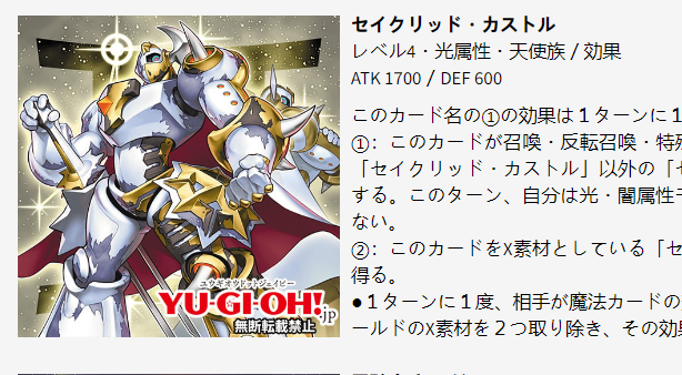 ①:这张卡超量召唤成功的场合,把这张卡1个超量素材取除才能发动。从自己的卡组·墓地选1只4星以上的通常怪兽加入手卡。