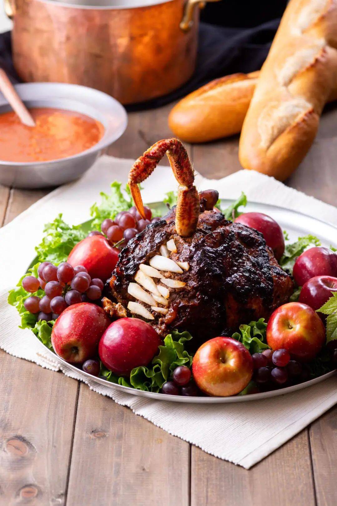 烤完后,将它放到用生菜装饰的盘子上,放上苹果以及葡萄当装饰。