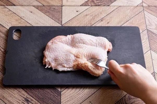 将 「步骤 1」 以及 「腌料 A」 一起放到碗中,用力按摩鸡腿肉,使其入味,并放到冰箱中腌制三小时以上。