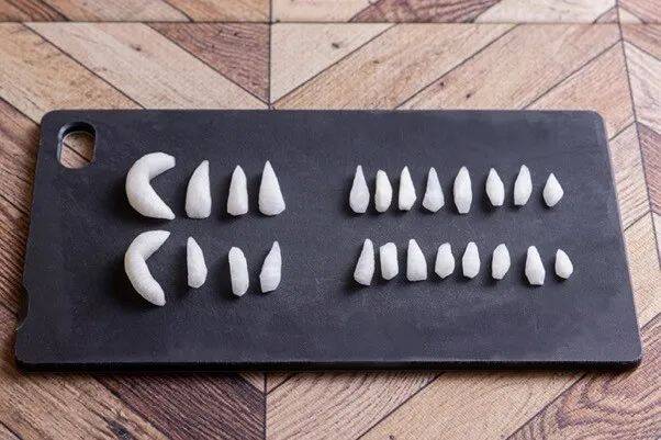 将白萝卜切成长柱状后,在削成兽牙的形状 ( ※要准备两倍的白萝卜兽牙,一部分当烧烤时的假牙,一部分在料理完成后当装饰使用)。