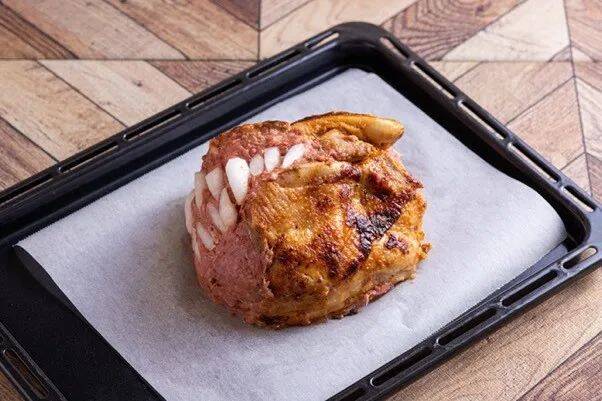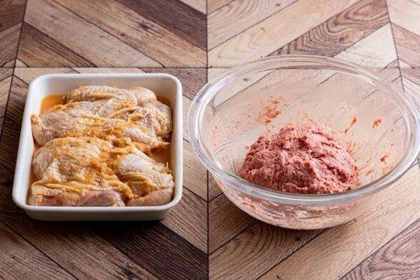 在烤盘上铺上烘培纸,将步骤 3 中一半的绞肉铺上当基座,然后将剩下绞肉,夹入步骤 5 的两片鸡腿肉中,与基座如上图般进行合并。