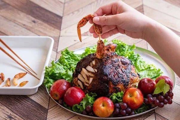 取下假牙,改放上装饰用假牙,並用竹签固定住毛蟹脚当最后装饰。