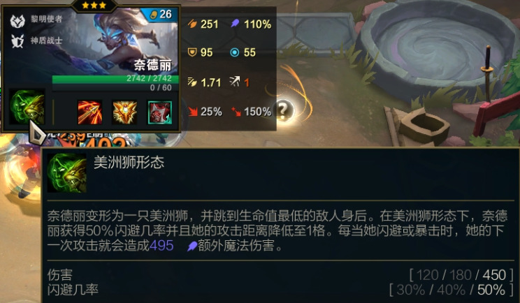 豹女阵容输出主C。其强势点就在于释放技能后,增加40/40/50%的躲避几率,变相增强极高的坦度,另一方面技能释放后增加如果闪避或暴击时,下次攻击就能造成额外的超高魔法伤害;另一方面豹女变身后会找寻敌方血量最近棋子,补刀非常快。