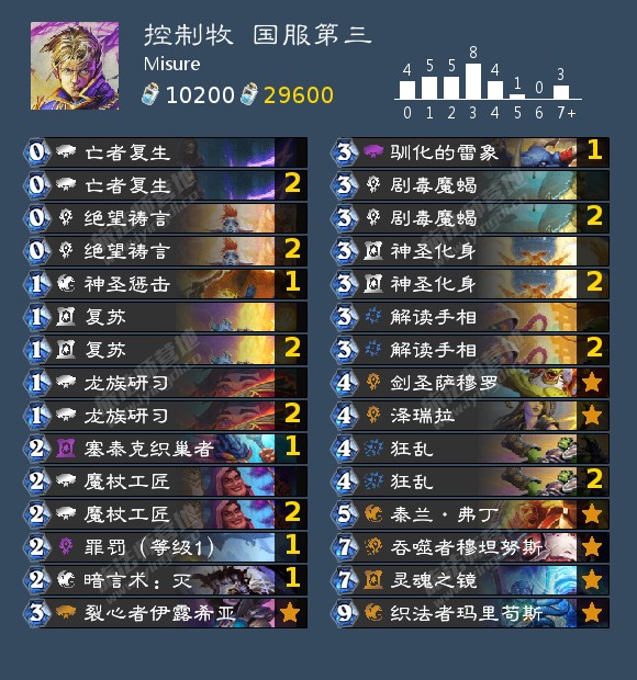 至于控制牧,刚一看到这卡组时我横竖睡不着,仔细看了半夜,才从牌组里看出字来,整个卡组都写着两个字是“反手”!至于究竟要选择蓝龙-雷象体系还是倦怠光波-秘教侍僧体系,主要取决于分段环境——如果所在分段中吸血瞎或者是直伤快攻较多,则应选择前者,理由是织法者玛里苟斯可以大量过牌,进而找到珍贵的回复/裂心者伊露希亚;如果所在分段中有很多结合场面来做输出的卡组,则应选择后者,理由是倦怠光波常可以配合除奇致胜和校长克尔苏加德做到清场甚至是返场,甚至可以一波奠定胜局。