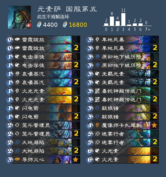 -雷霆绽放*2、电击学徒*2、大地崩陷*2、无羁元素*2、魔像师卡扎库斯、迷雾行者*2;