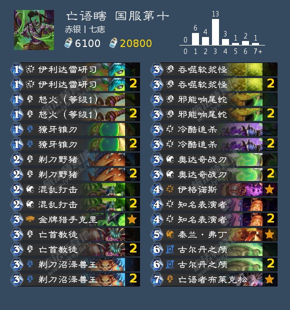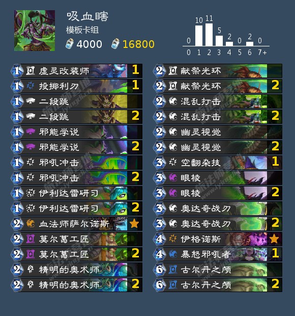 接下来再说调整。目前常见的亡语瞎调整思路有两种:第一种调整思路是携带怒火(等级1)、冷酷追杀、奥达奇战刃、伊格诺斯,放弃过于笨重的伊利达雷审判官。这一调整主要有两个好处:一是显著降低了卡手、卡古尔丹之颅的概率;二是在前中期具有一定爆发能力;但是有一个很大的问题——这一思路在终结端的散牌太多,对上环境中最热、最强的恩佐斯牧时比不上传统构筑。第二种调整思路则是带上滑翔,这一思路相对比较新,我很难判断其强度,因此将其归于调整而非优化。
