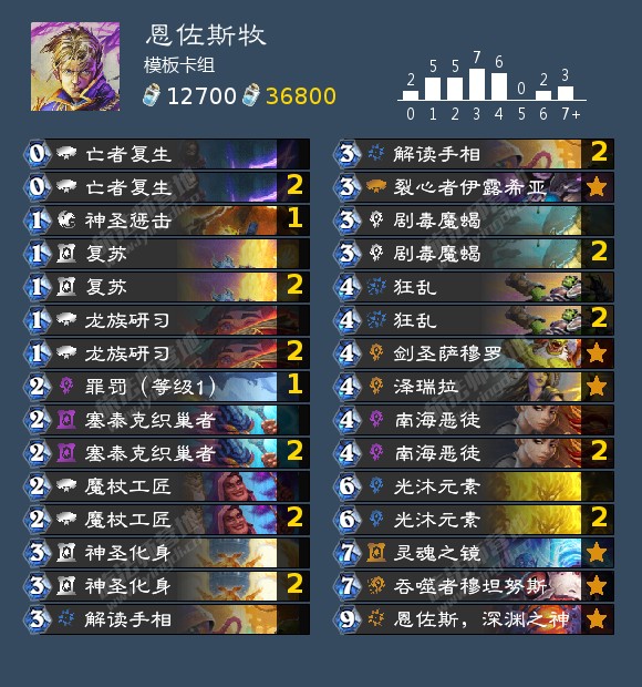 恩佐斯牧的构筑原本已经趋于完美,但是本周依旧有不少高分玩家想了一些点子。无论做出怎样的调整,神圣惩击和塞泰克织巢者似乎都首当其冲,这主要是因为恩佐斯牧本身确实没带太多低费指怪法术(如暗言术:灭等),而且牧师衍生无论在数量上还是在质量上都已经冠绝十个职业,哪怕节奏塞泰克了,打外战其实还是绰绰有余;而就算是塞泰克刷了几个法术,打牧师内战却也总感觉差点意思。从下面列出的单卡替换中不难看出,人们舍弃这两张牌很多时候就是为了去强化某些对局,比如说用克苏恩,破碎之劫来内卷,又或者说用安瑟教士来抗快和打吸血瞎;当然了,还有另外一种可能,即为了加入什么牌而舍弃了神圣惩击,然后发现塞泰克变得特别不好用,干脆去了算了= =