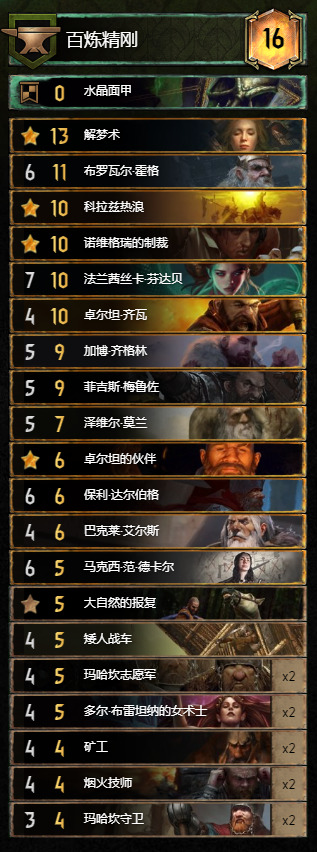 因为矮人领袖技能就是一张法术,理论上法兰西丝卡只需存活一回合就可以领袖+解梦+热浪,速读出2张热浪,亦或者领袖+解梦+制裁 ,速读两张制裁拉两张玛哈坎守卫爆30多点不在话下。比那种法兰西斯卡配解梦+森林召唤+法芙+自然牌的combo好用多了。