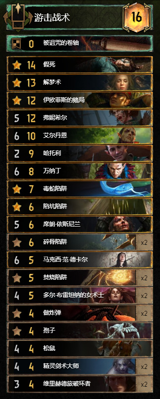 成了,就是这套了。游击战术是我在反复实验了十面埋伏和活力回春之后选用的,这个领袖技能可以更好的配合万纳丁的伏击,让伏击更有可能打出9点的收益。(万纳丁在场的情况下伏击死对面一个3血,我方生成2个3点的精灵暗箭手)
