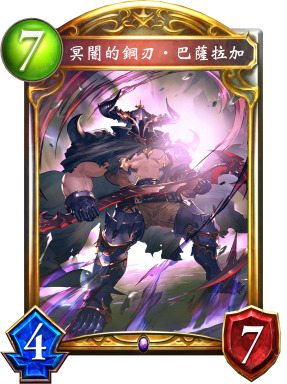 冥暗的钢刃·巴萨拉加可以在后期配合异族魔境·克里斯托福的主战者效果,在每个回合都化身不可被指定的6/9守护,提供强大的站场和护脸能力。