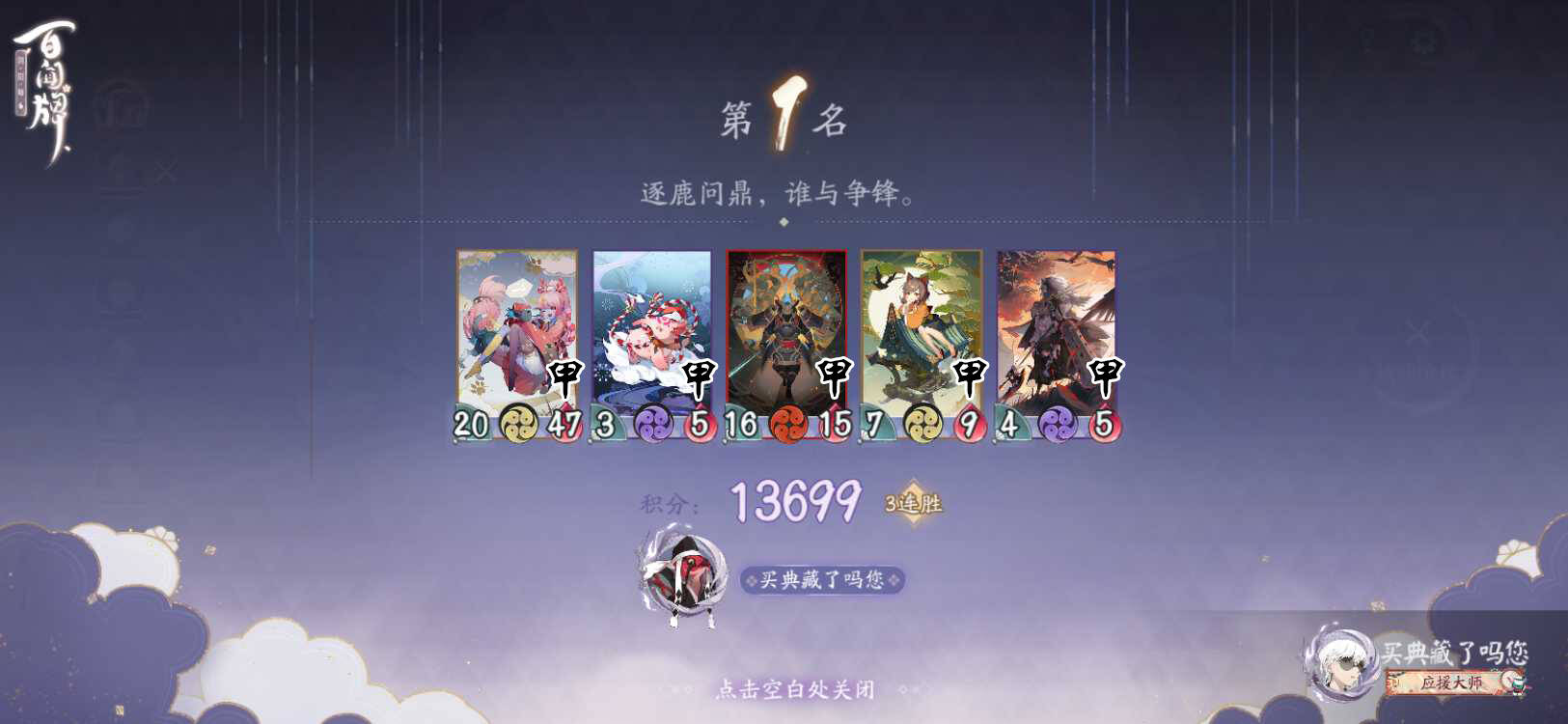 天井下+海坊主领衔的护甲暴击流,有护甲才有暴击,有暴击则加2护甲。云之妖的暂离导致大量暴击式神离开卡池,那么想要“小身材”打出“大伤害”就要靠天井下了.核心式神为天井下+海坊主,海坊主全体加盾,天井下站位要注意在海坊主右侧即可。