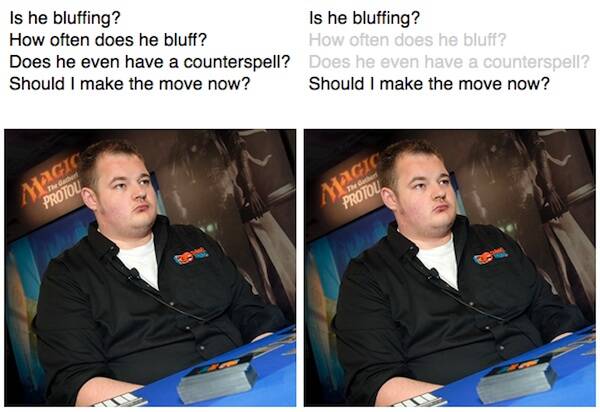 比如说,想象一个对手从没在是否有康上唬过你,但是总是能在你出一个咒语时康你,如果你能计算出他手中还有康的概率,你就知道你是否要拍你的大炸弹了。