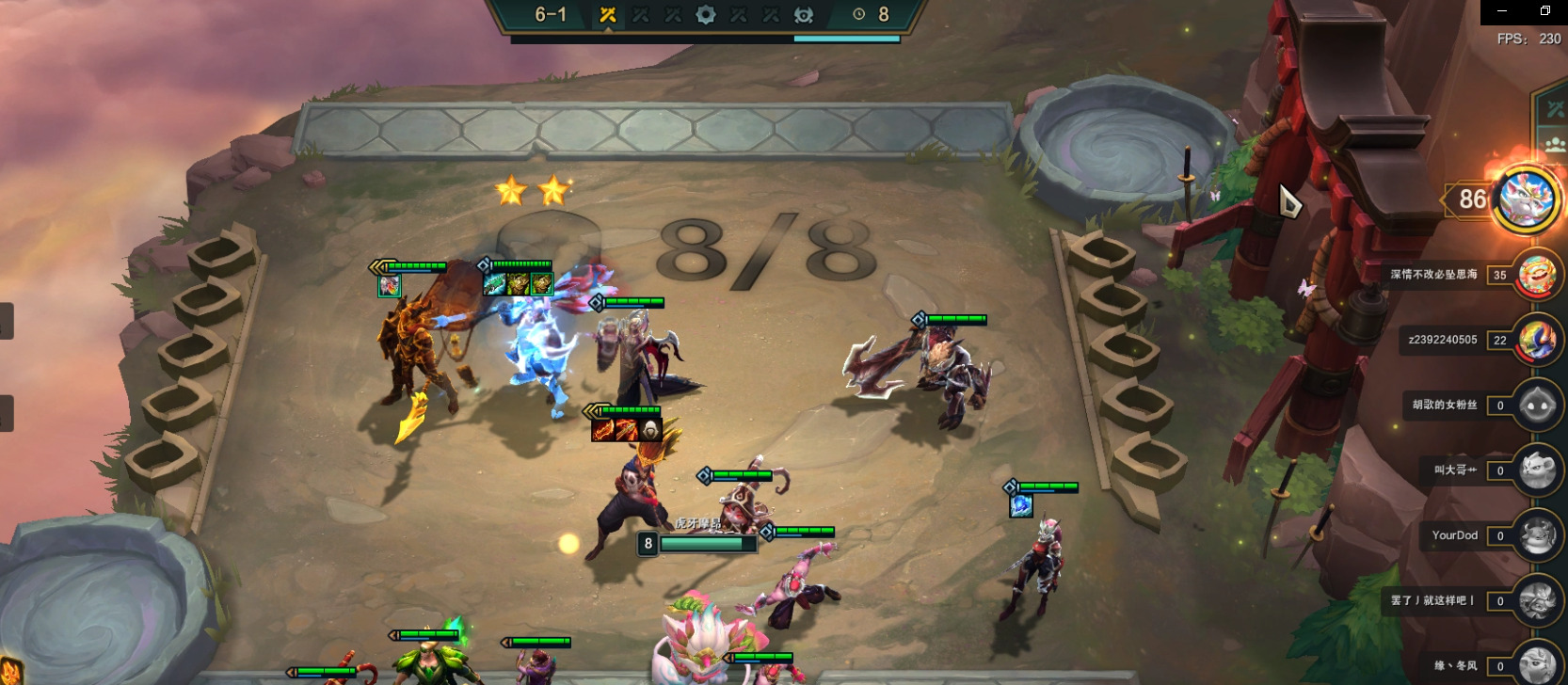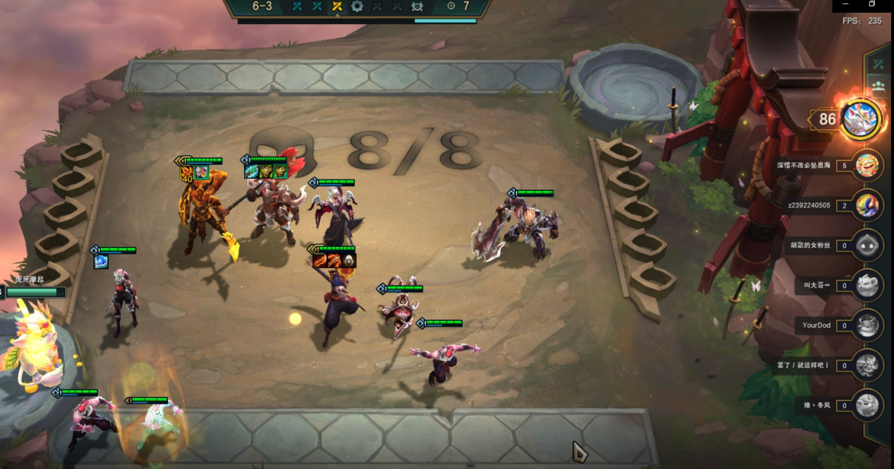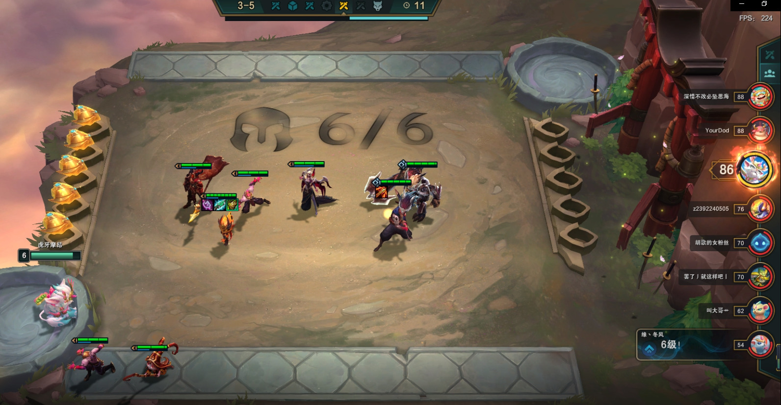 3阶段我们要做的就是稳定血量,不掉血和少掉血最好,场下对子多可以小D卡,不要等掉血后在D或硬抗到7人口在D,这样血量会下降后期容错降低。稳血的方法就是装备尽量合成,在场上才能形成战斗力。