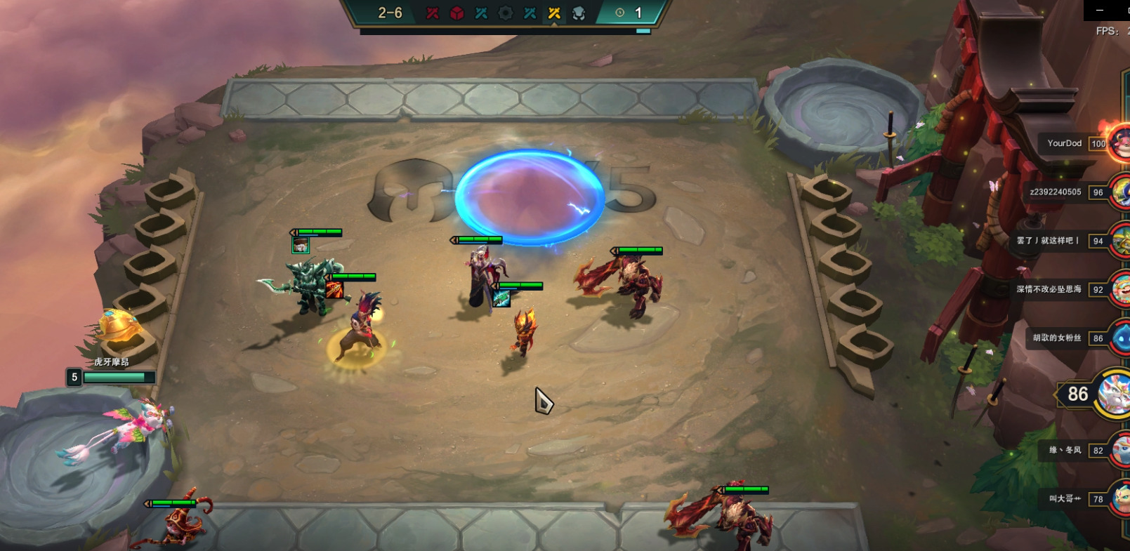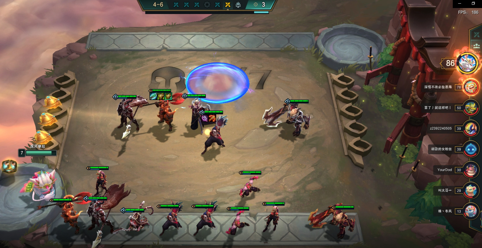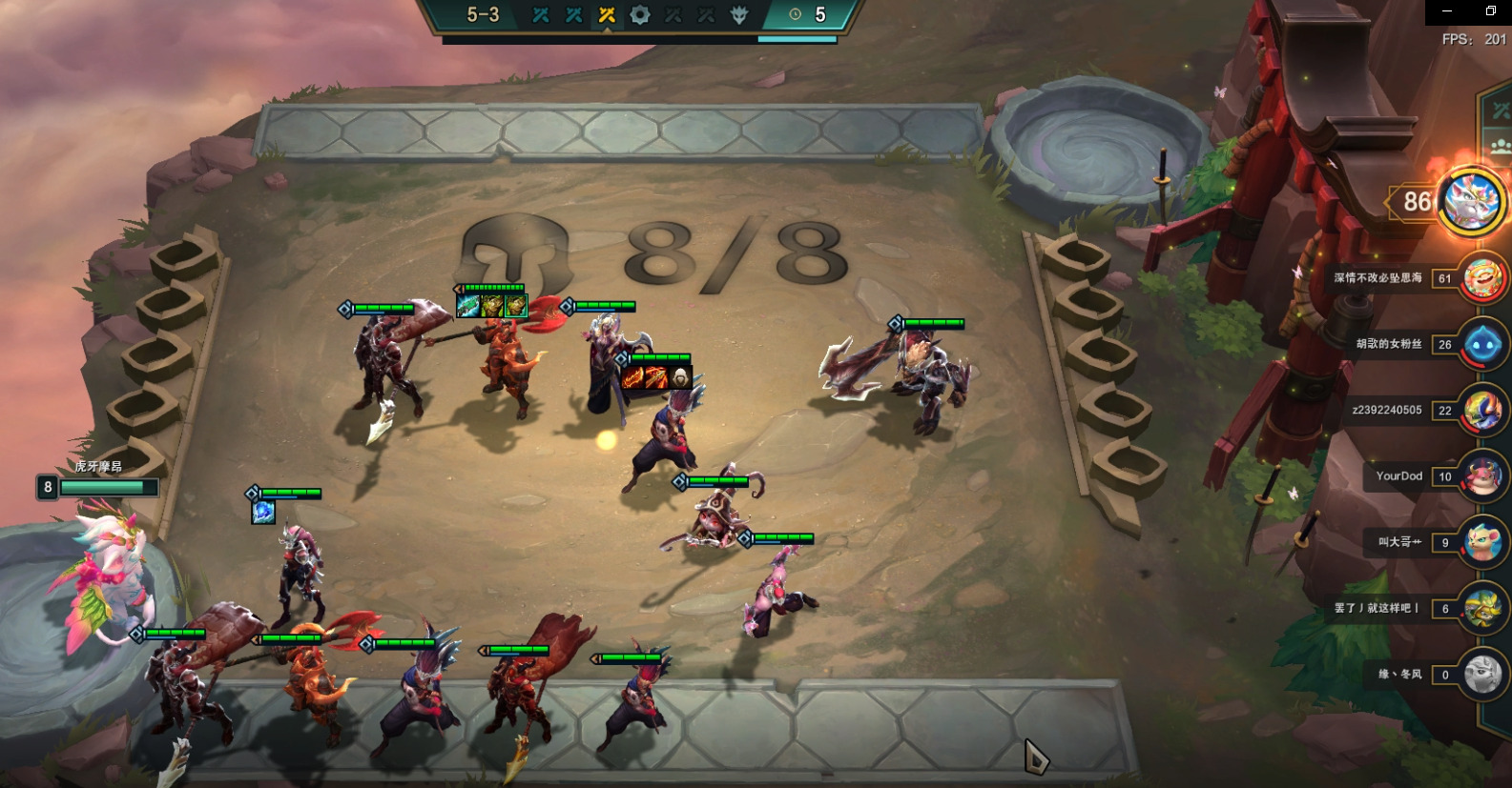 3阶段我们要做的就是稳定血量,不掉血和少掉血最好,场下对子多可以小D卡,不要等掉血后在D或硬抗到7人口在D,这样血量会下降后期容错降低。稳血的方法就是装备尽量合成,在场上才能形成战斗力。