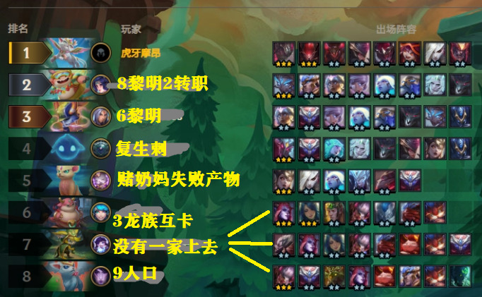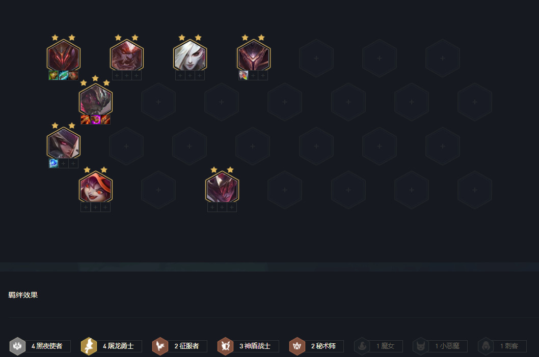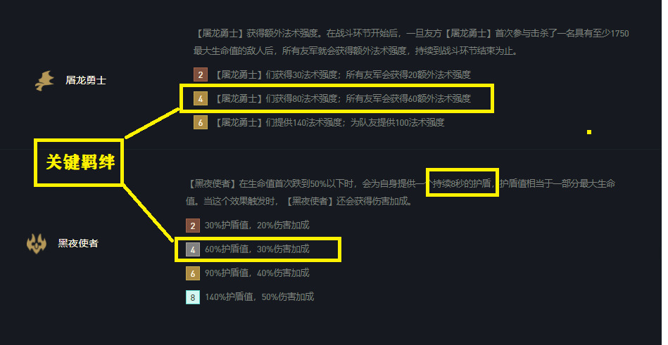 3-2左右拉6人口,这时候可适当D卡,阵容开始向黑夜屠龙转换,添加3神盾羁绊,3神盾这版本加强,坦度很高,特别是潘森与巨魔都是很能抗的棋子。