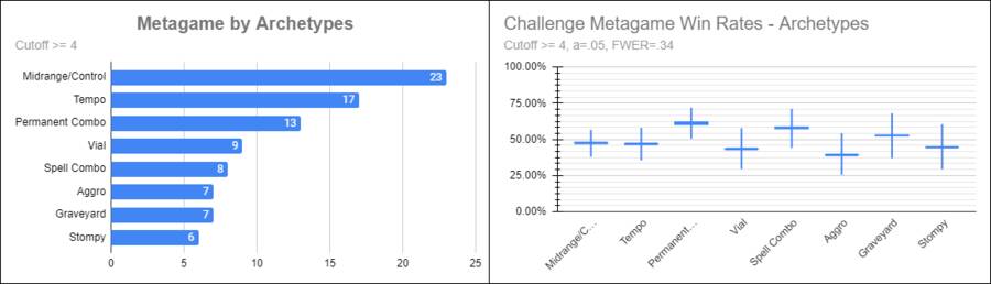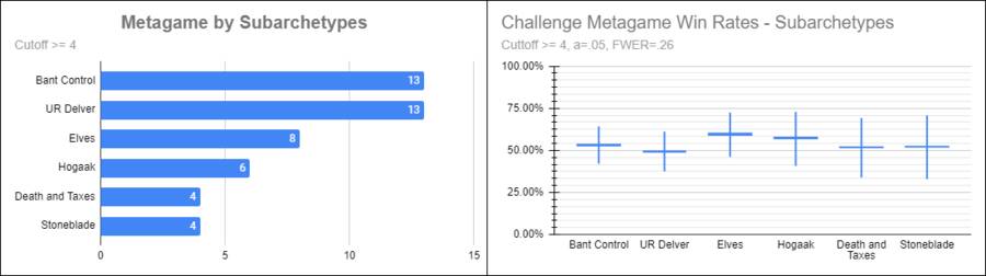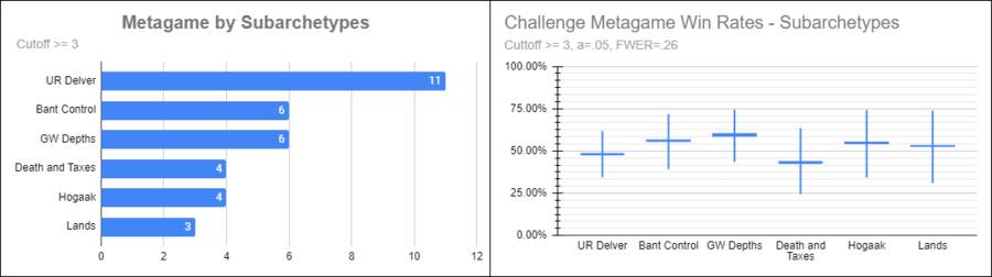 正如我们所见,红蓝掘密师 的数量遥遥领先。但当一套牌成为环境顶流时,必然会遭到大量针对,能从这场比赛里很好的反映出来针对的成功性。红蓝掘密师虽然占比很高(11/64),但平均胜率低于50%,而占比排在后面的班特控制 、白绿深渊 和霍佳葛 都有很好的表现。下面是八强套牌
