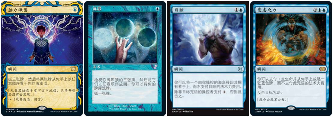 这里先要声明一点,我们所说的“掘密师”并不是指的掘密师 这张牌,“掘密师“已经成为了一种套牌框架的代名词,该类套牌围绕掘密师 ,辅以脑力激荡 、沉思 、目眩 、意志之力 、否认之力 等强大的蓝色咒语,这些蓝色咒语已经统治了薪传很长一段时间