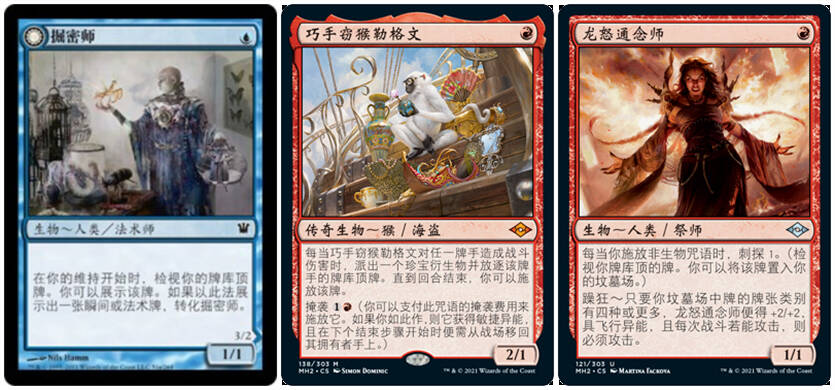 我们在之前的文章 里已经讨论了这些 cantrip 的强度水平,也对掘密师框架发表了一些看法,对于薪传玩家来说都是老生常谈了。现在掘密师不仅收获了两个新的超高效威胁(巧手窃猴勒格文 、龙怒通念师 ),还收获了一个强大的终结手段(黯潮龙侯 ),这又掀起了我们对掘密师的讨论。在斯翠海文的展现迭代 对掘密师进行补强后,人们就已经对掘密师在环境里的突出地位表示不安