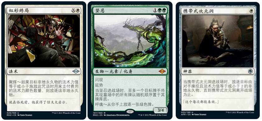 MH2给许多套牌都带来了实质的补强,一些新的威胁和一些新的互动。像虹彩终局 、坚忍 等牌就非常适合对抗掘密师套牌里的低费威胁。别忘了下个系列《被遗忘的国度》里预览的新牌携带式次元洞 也能很好处理这些威胁