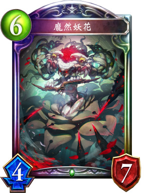 庞然妖花是不需要目标、场地和使用条件的激奏牌(唯一要求是当前费用≤5),可以与其他激奏牌一同在第2回合瞬念召唤森林游侠·维尔达,与妖精的眴焕、恒久的光辉·艾琳和船孃精灵也配合良好。