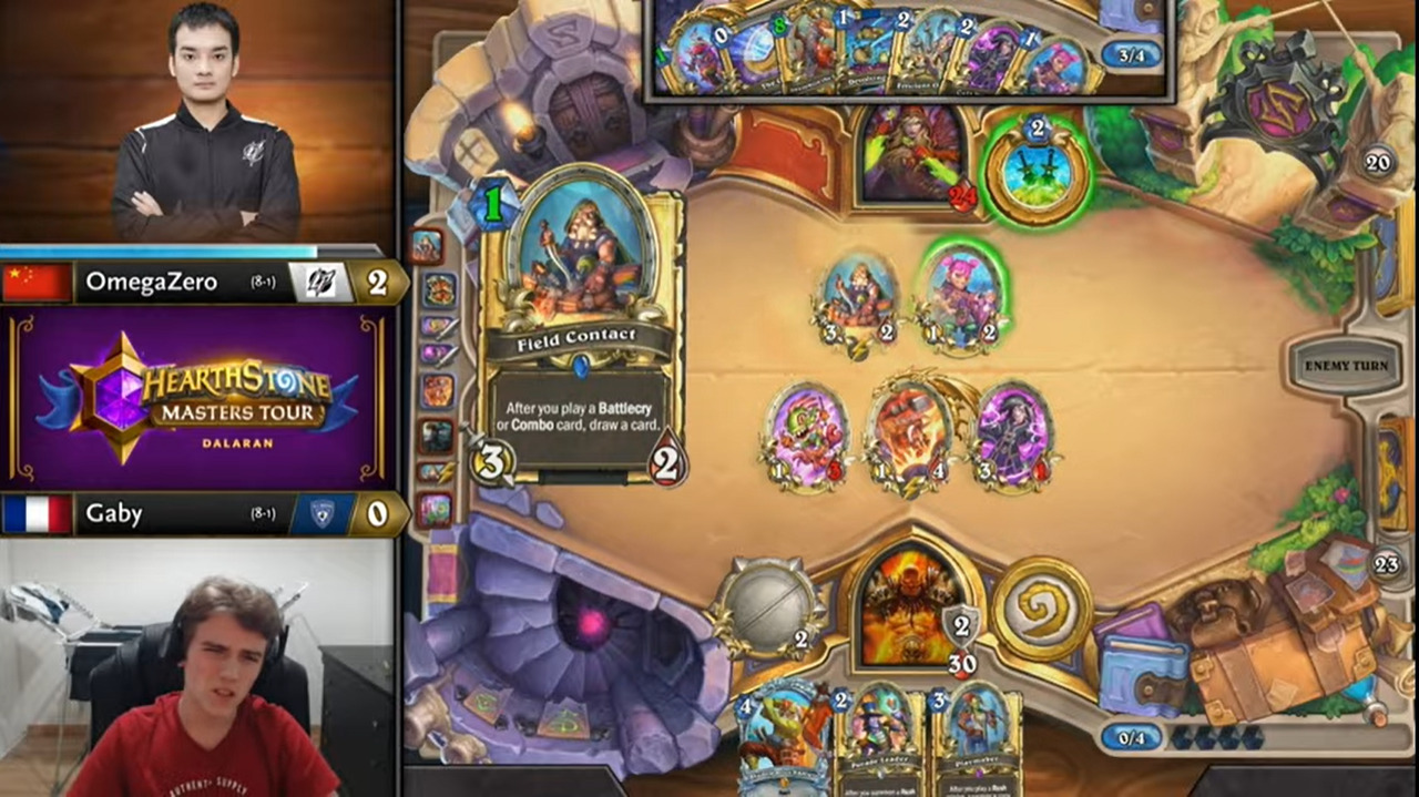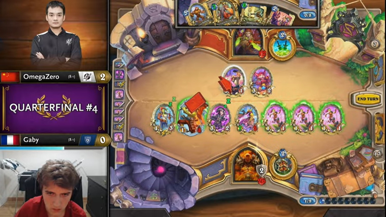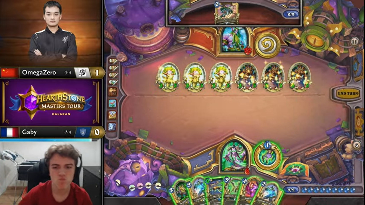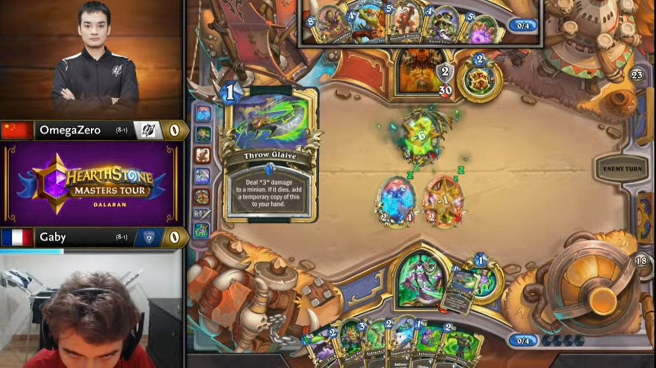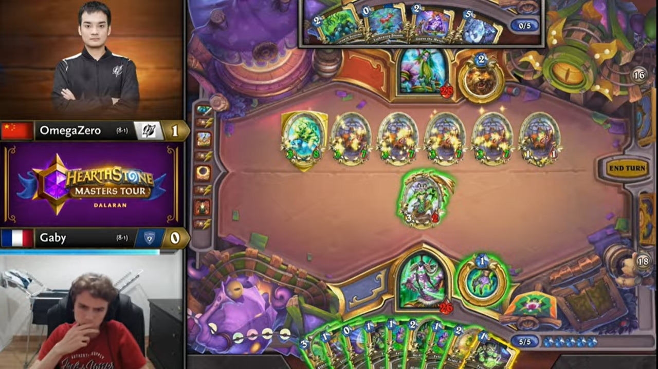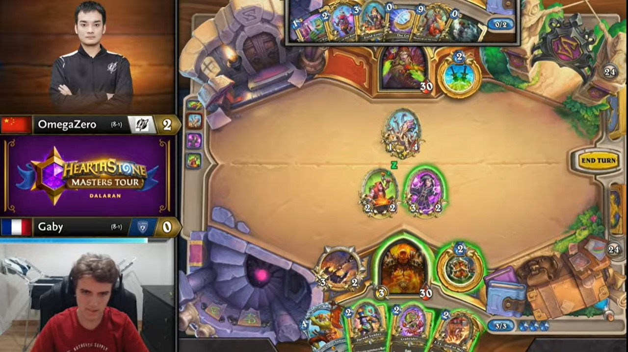 Gaby起手顺拍但2费出的不是巡游领队,而OmegaZero八爪鱼开局,于是顺利地减到了费,而且还减到了原野人,还有暗影步。OmegaZero一连小刷了两波,拉开了两人的手牌差距。Gaby唯一的好消息是剑圣在手。
