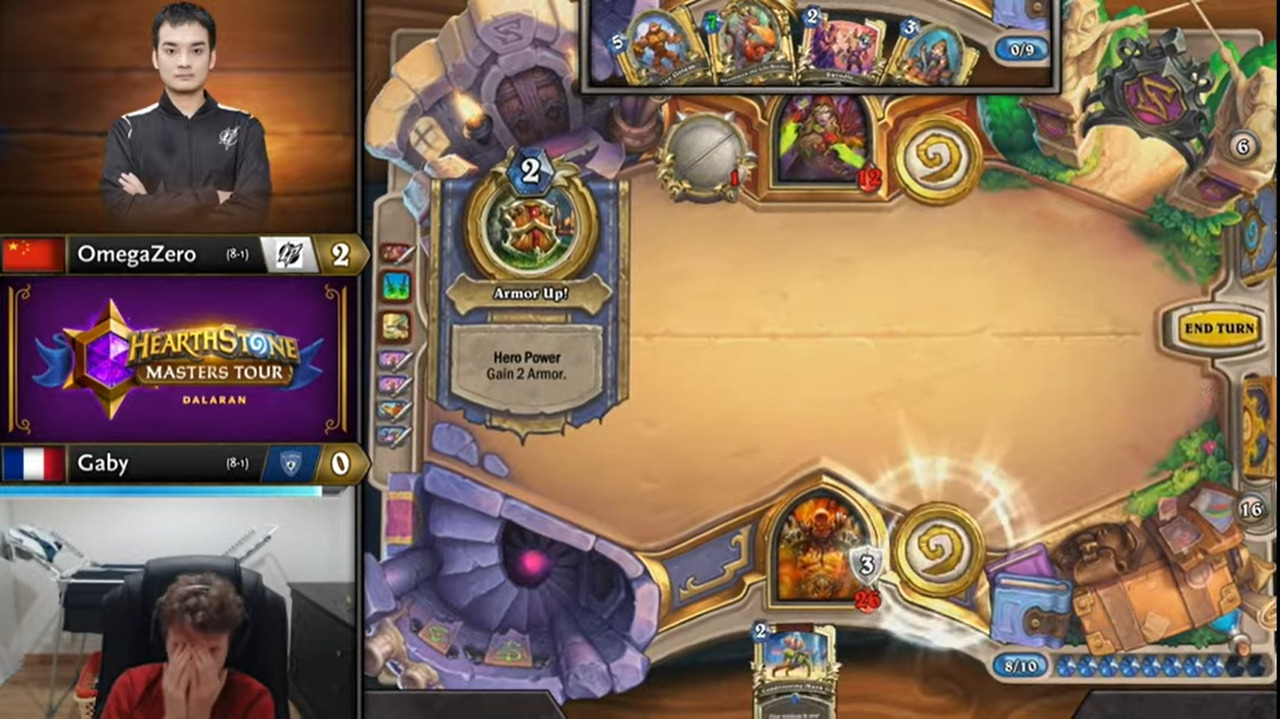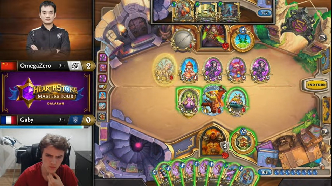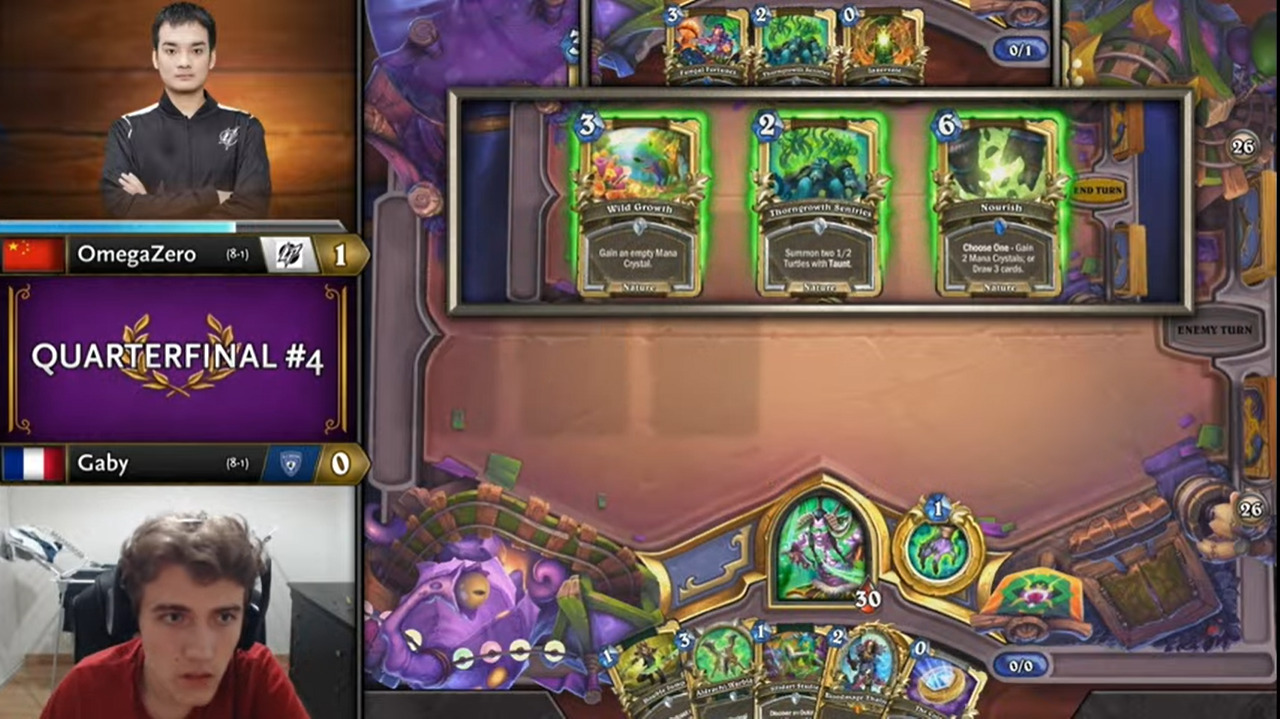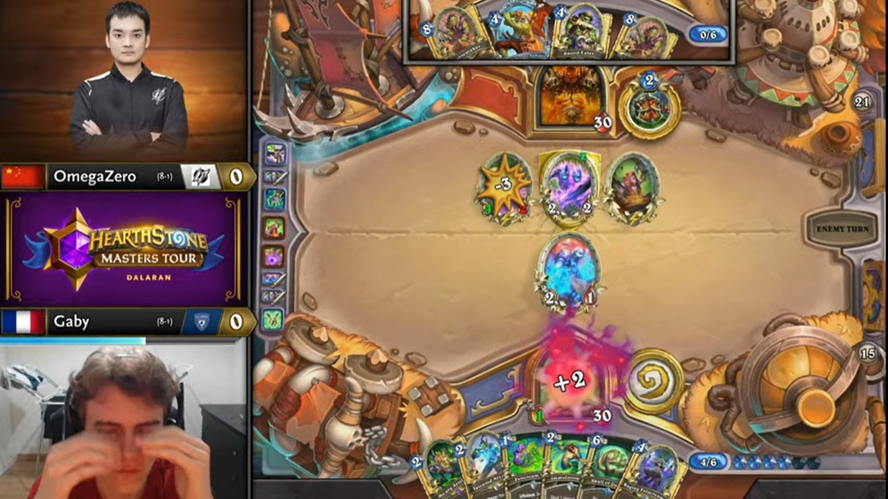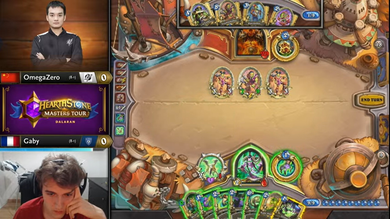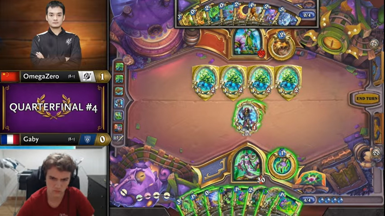Gaby起手顺拍但2费出的不是巡游领队,而OmegaZero八爪鱼开局,于是顺利地减到了费,而且还减到了原野人,还有暗影步。OmegaZero一连小刷了两波,拉开了两人的手牌差距。Gaby唯一的好消息是剑圣在手。