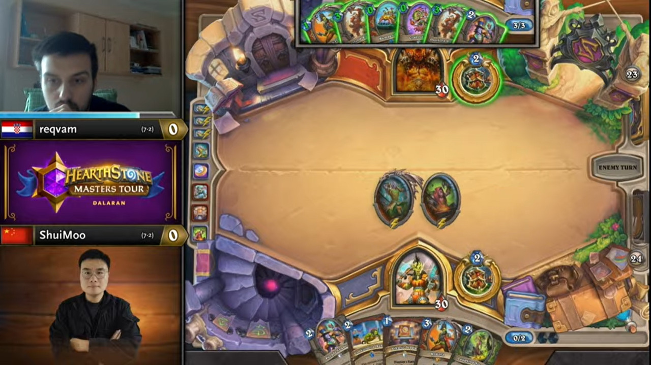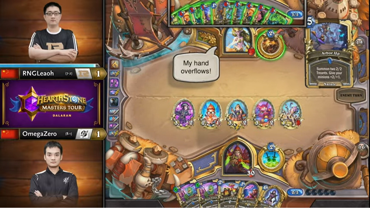 但Leaoh起手就有裂心者,长考之后Leaoh选择了换牌,既能再拖延一下风怒锤,还找到了萨满手里的解牌解了碎雷!