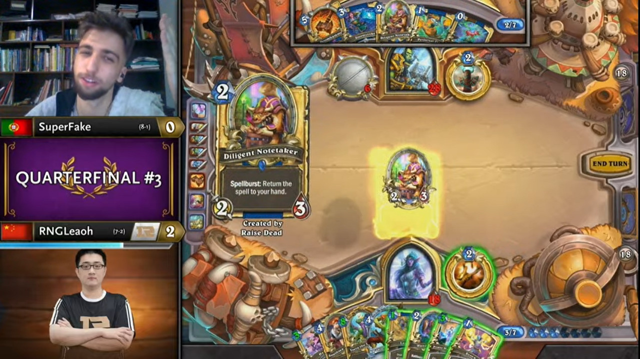 转机出现在换手时埋下的伏笔,Leaoh从亡者复生里随出了笔记能手,笔记能手复制到了回血,打乱了SuperFake两回合杀的计划!