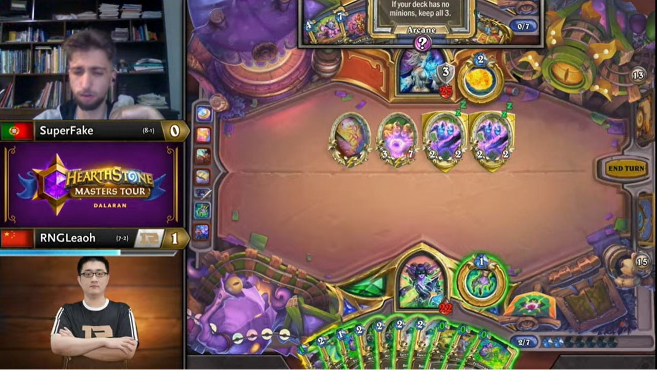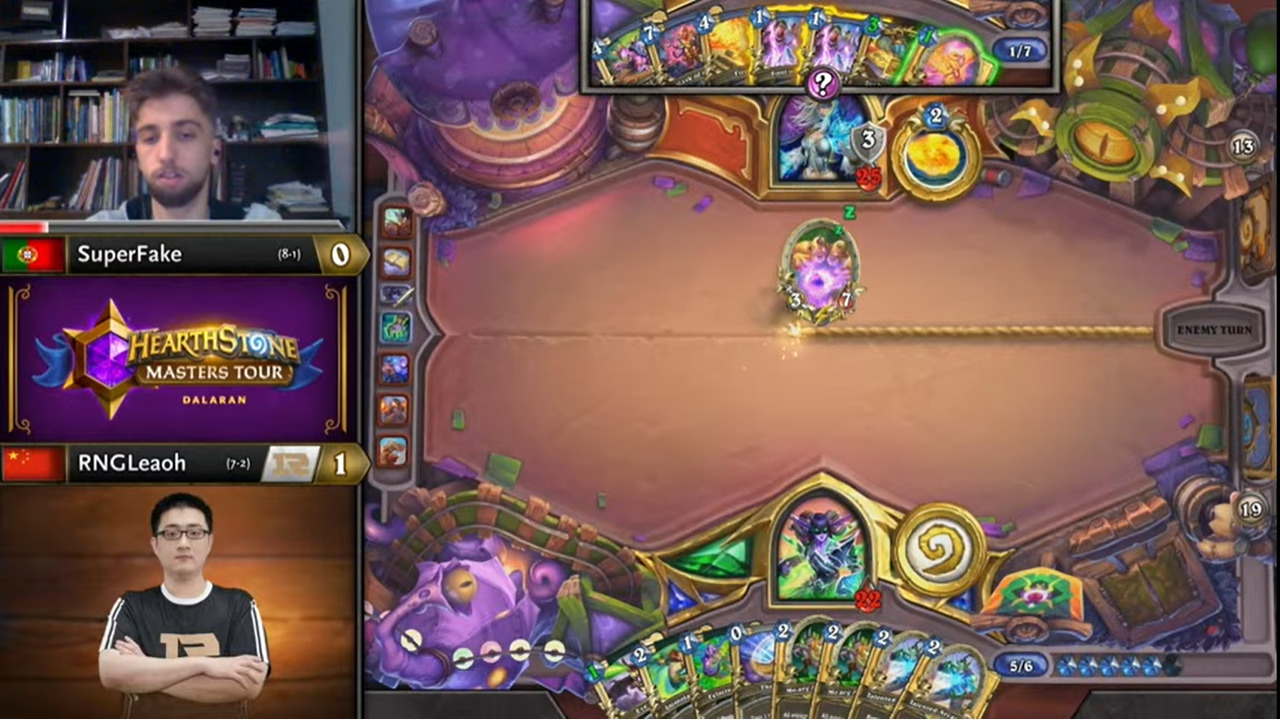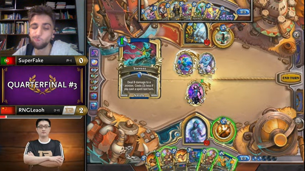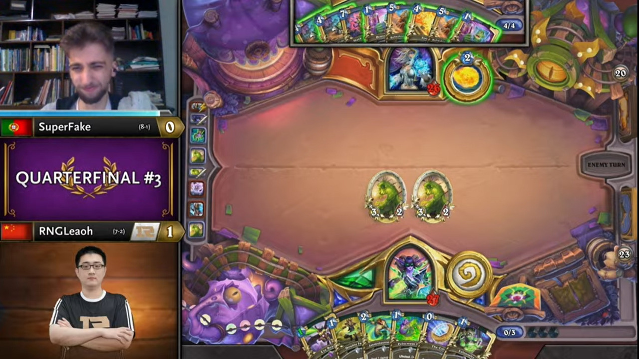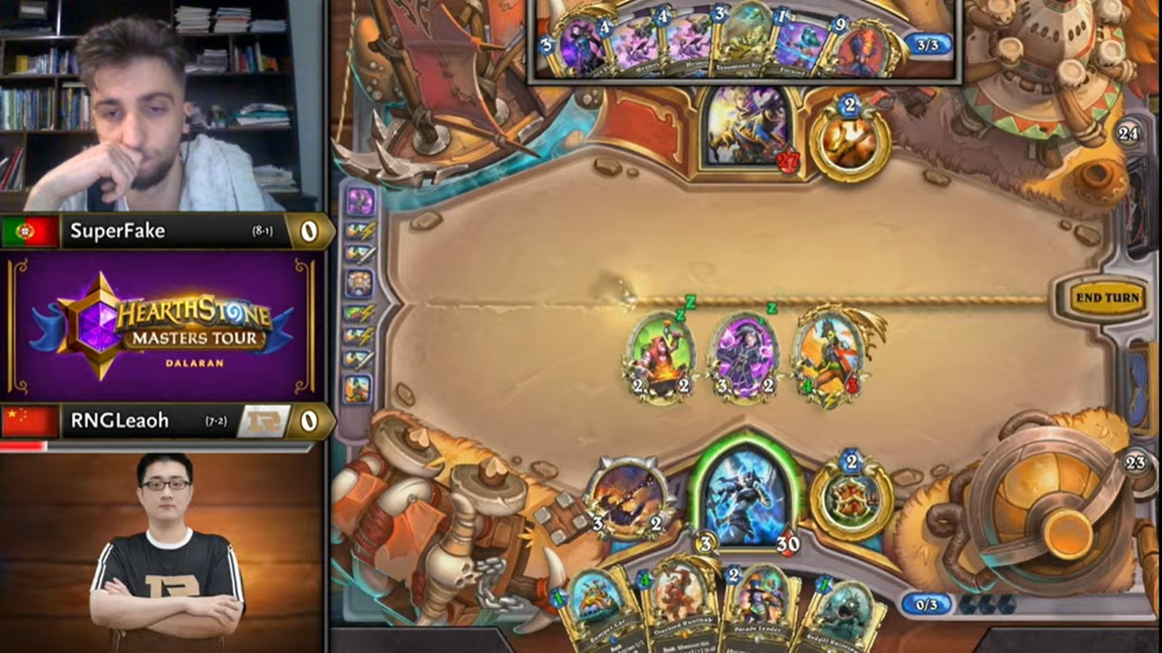 Leaoh的吸血瞎带了两个打法师没用的小软,而且起手手牌也都没什么用,不想正是这两个软把SuperFake搞得异常痛苦……SuperFake为了搏上限把能量之泉都换掉了,结果非但没胡,连个低费解都没有……