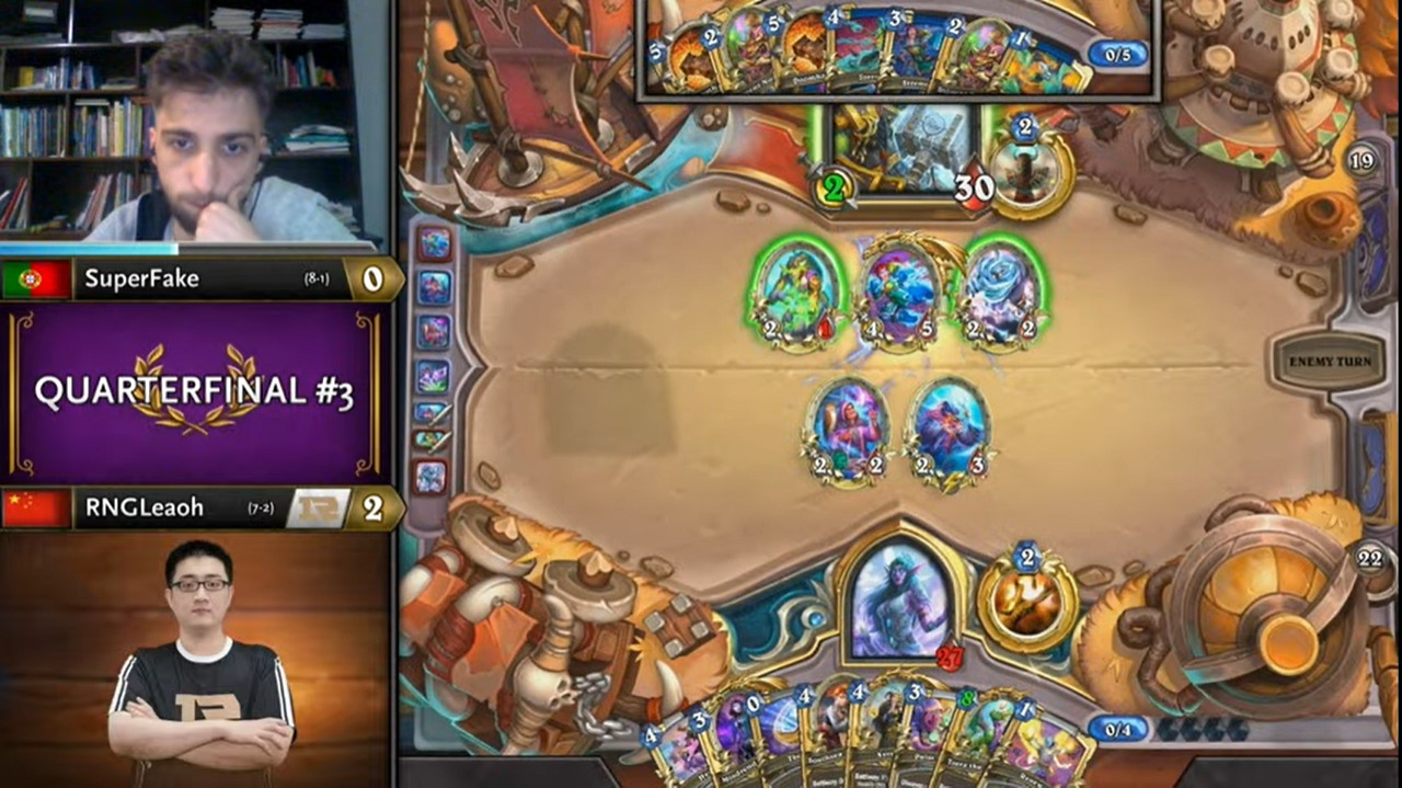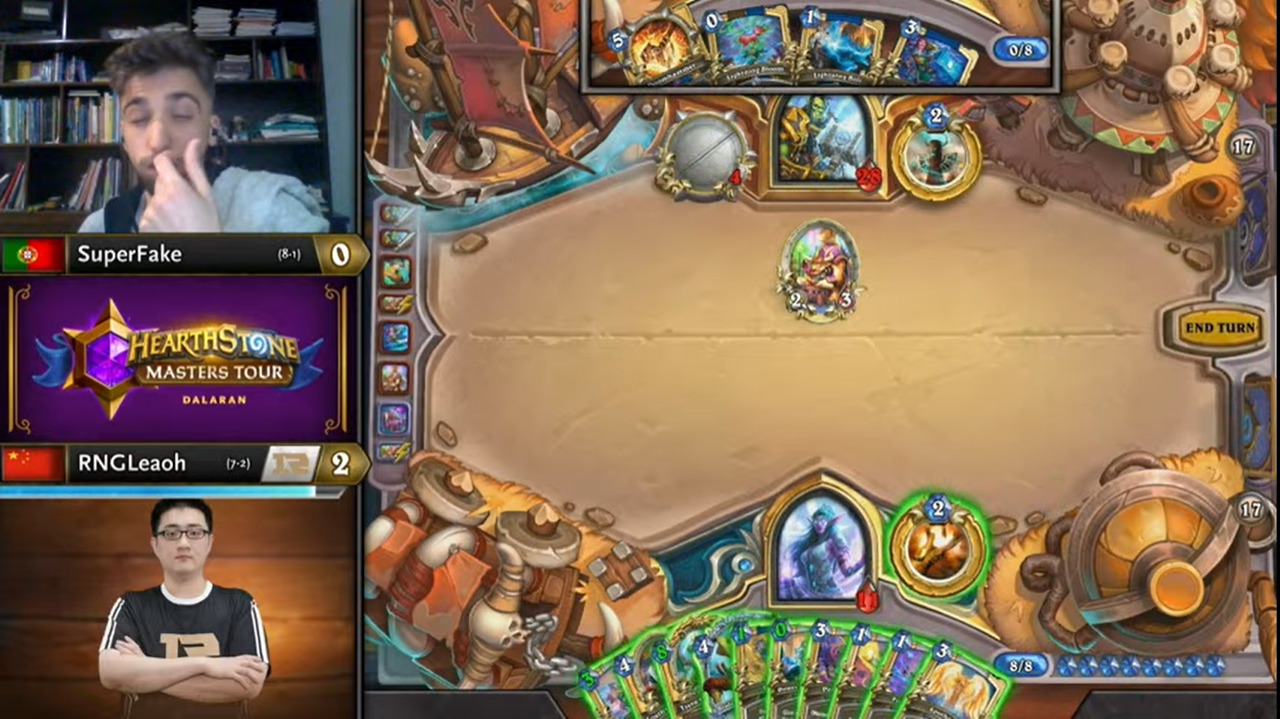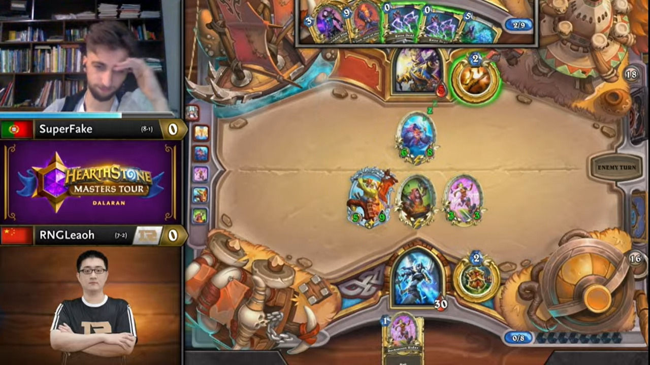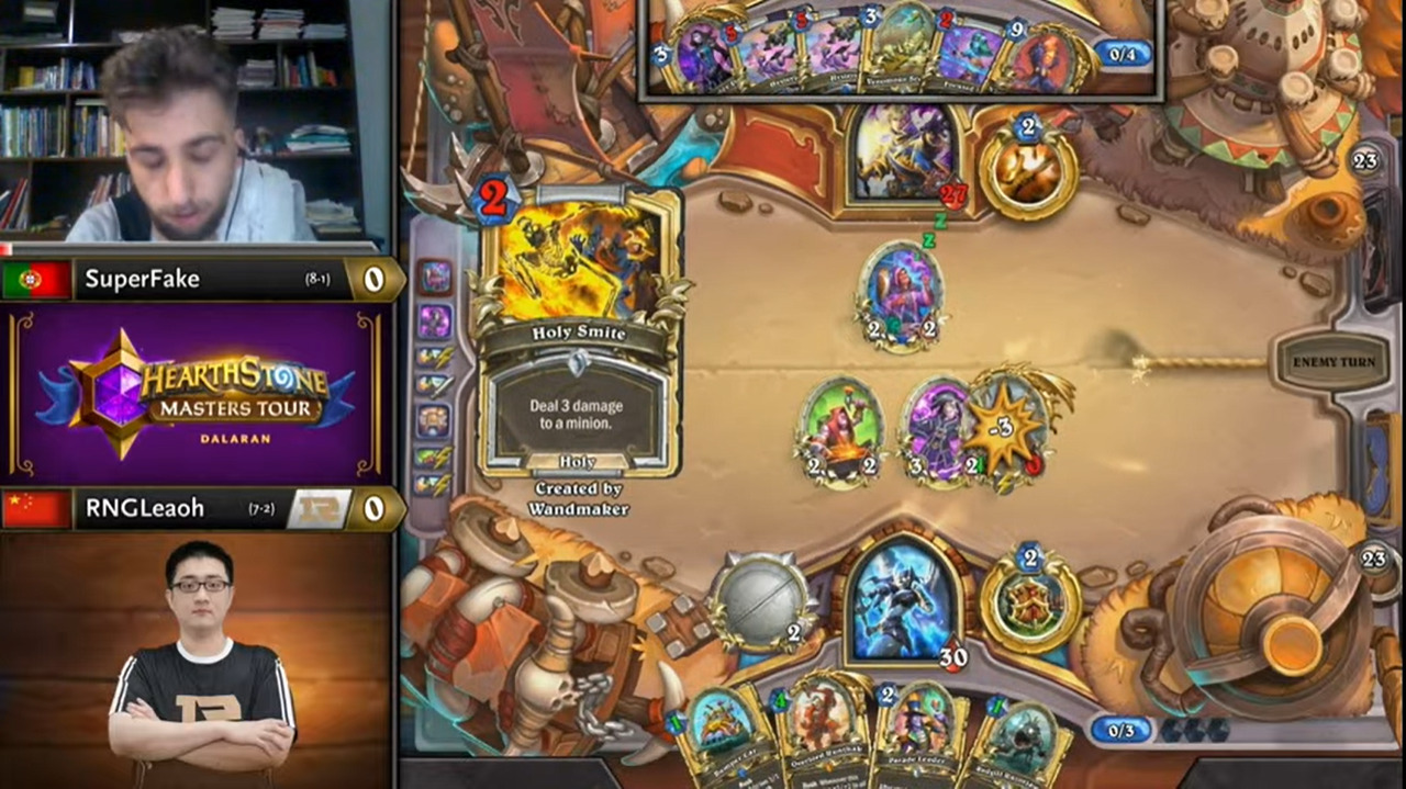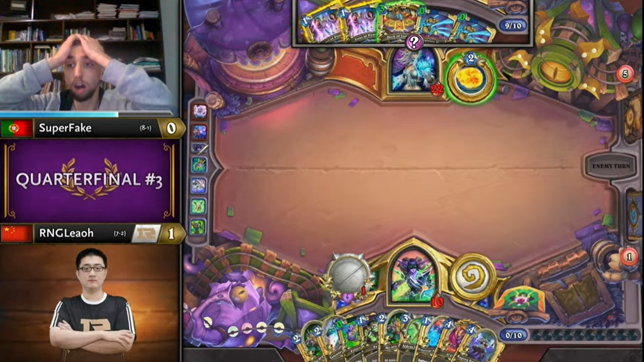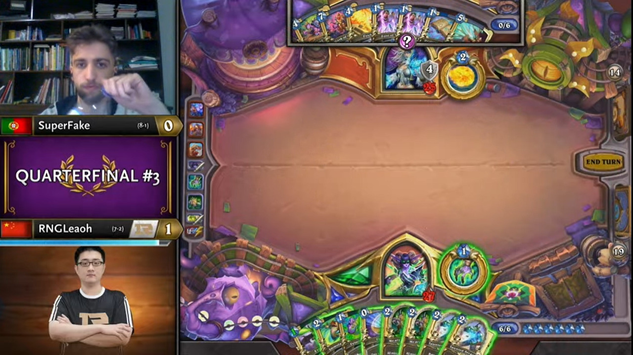 Leaoh的吸血瞎带了两个打法师没用的小软,而且起手手牌也都没什么用,不想正是这两个软把SuperFake搞得异常痛苦……SuperFake为了搏上限把能量之泉都换掉了,结果非但没胡,连个低费解都没有……