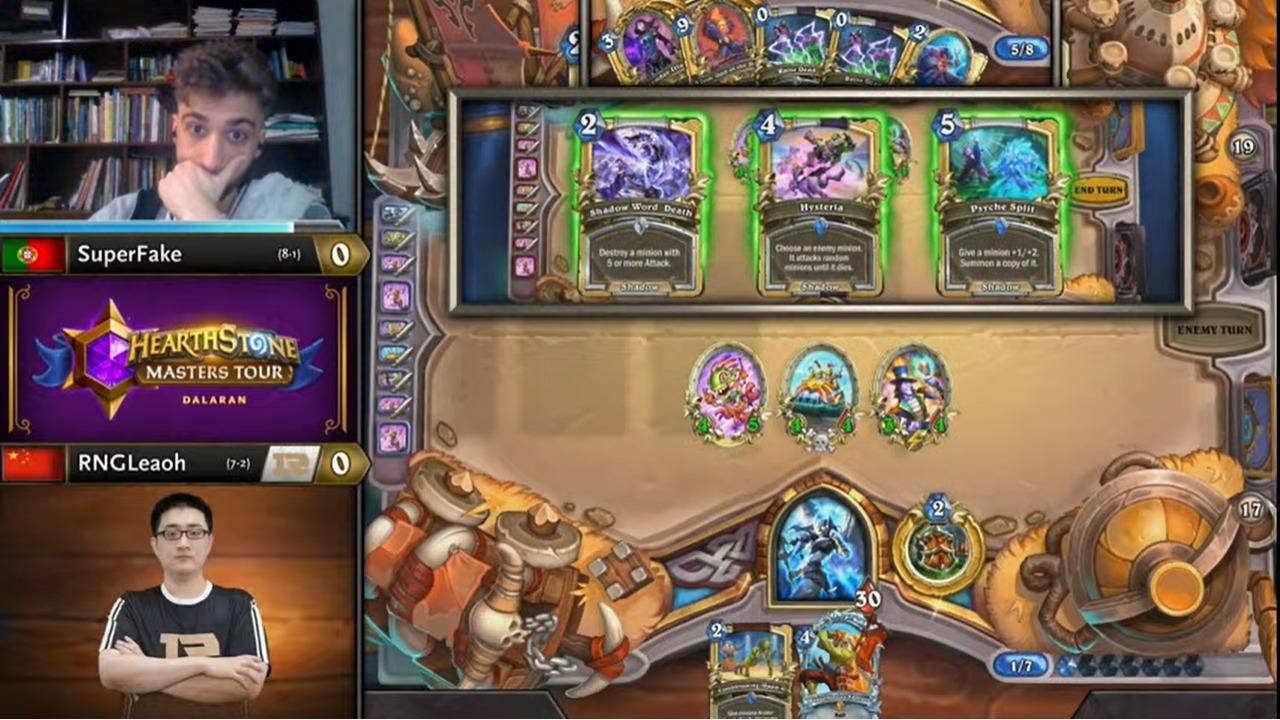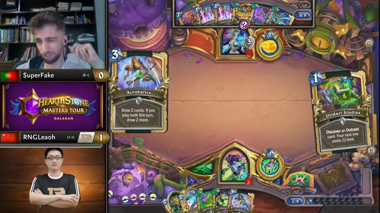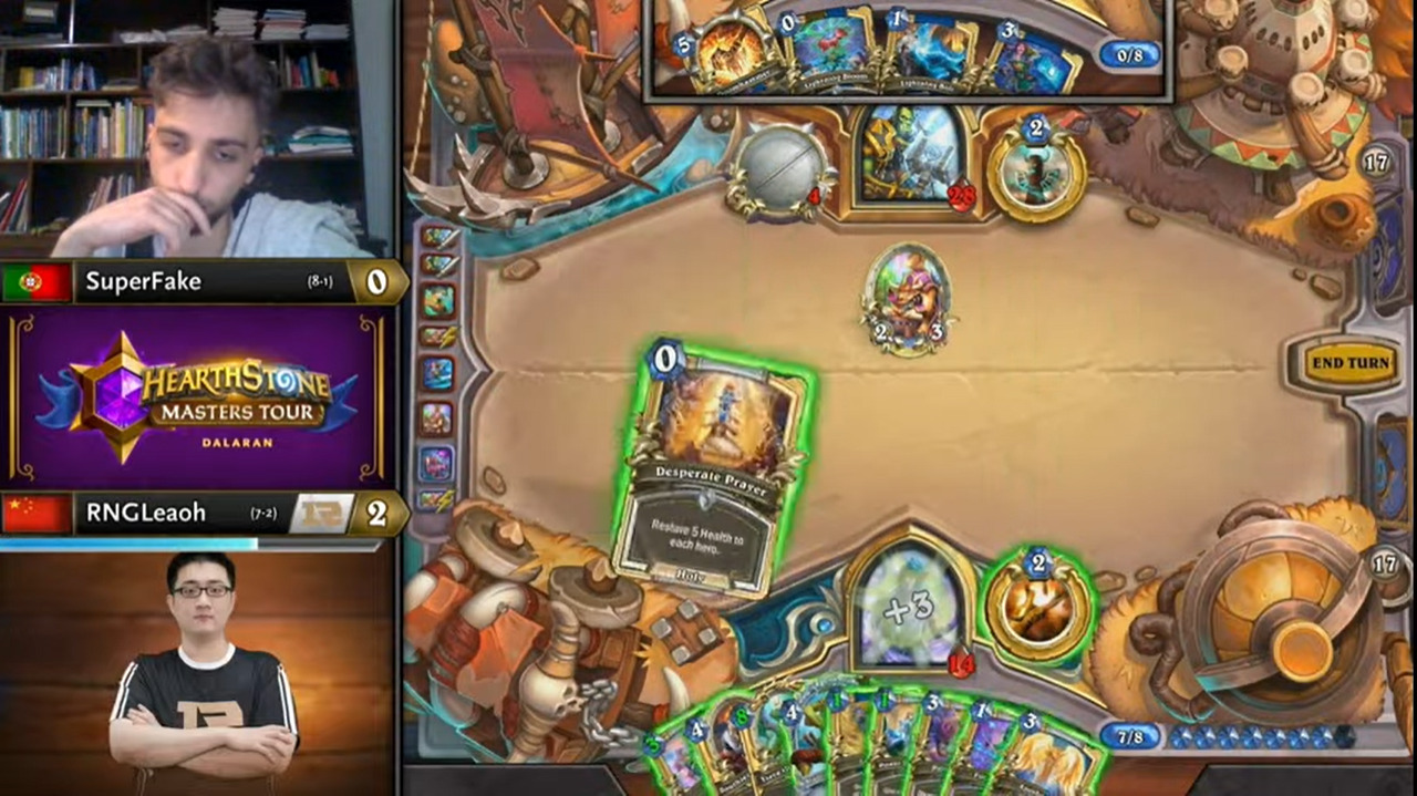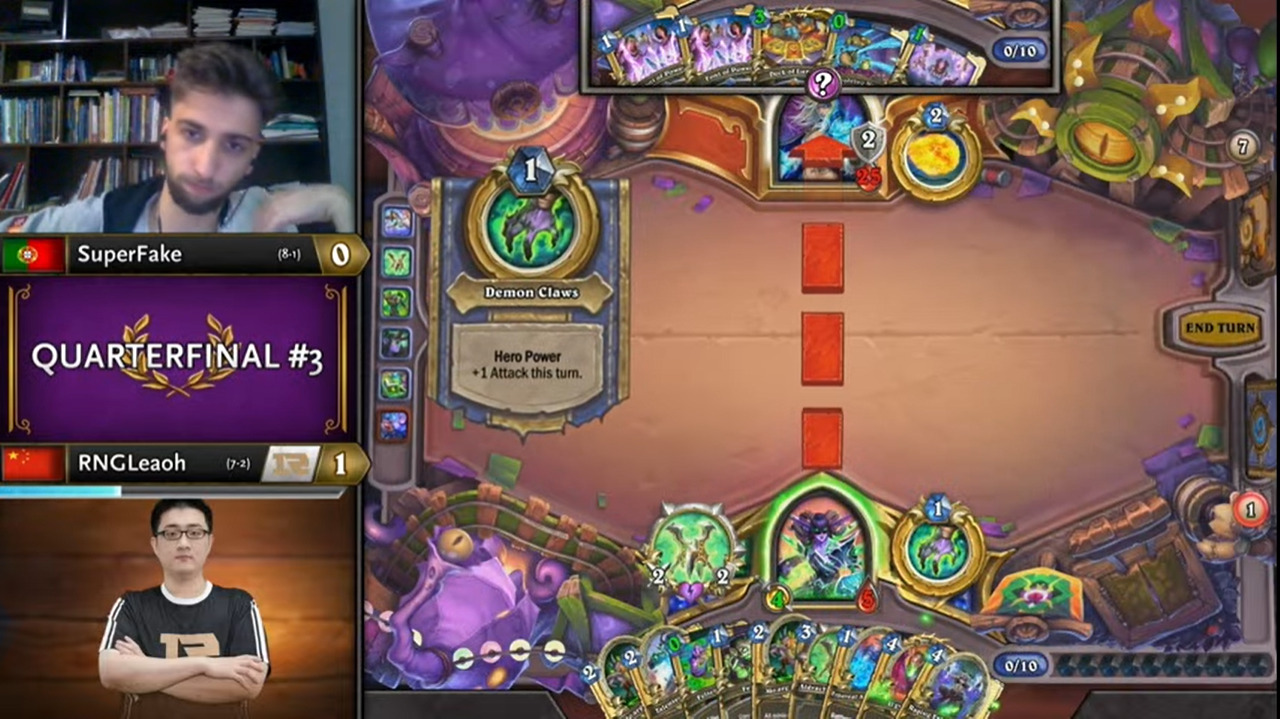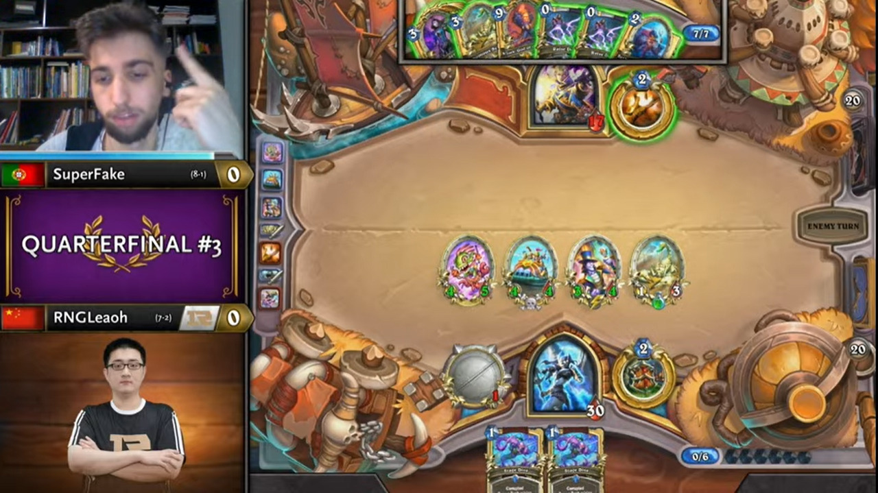 Leaoh的吸血瞎带了两个打法师没用的小软,而且起手手牌也都没什么用,不想正是这两个软把SuperFake搞得异常痛苦……SuperFake为了搏上限把能量之泉都换掉了,结果非但没胡,连个低费解都没有……