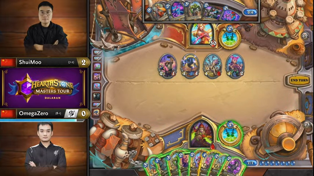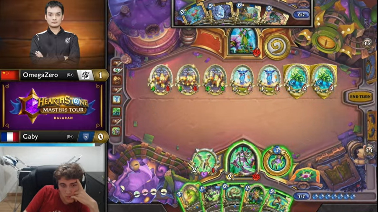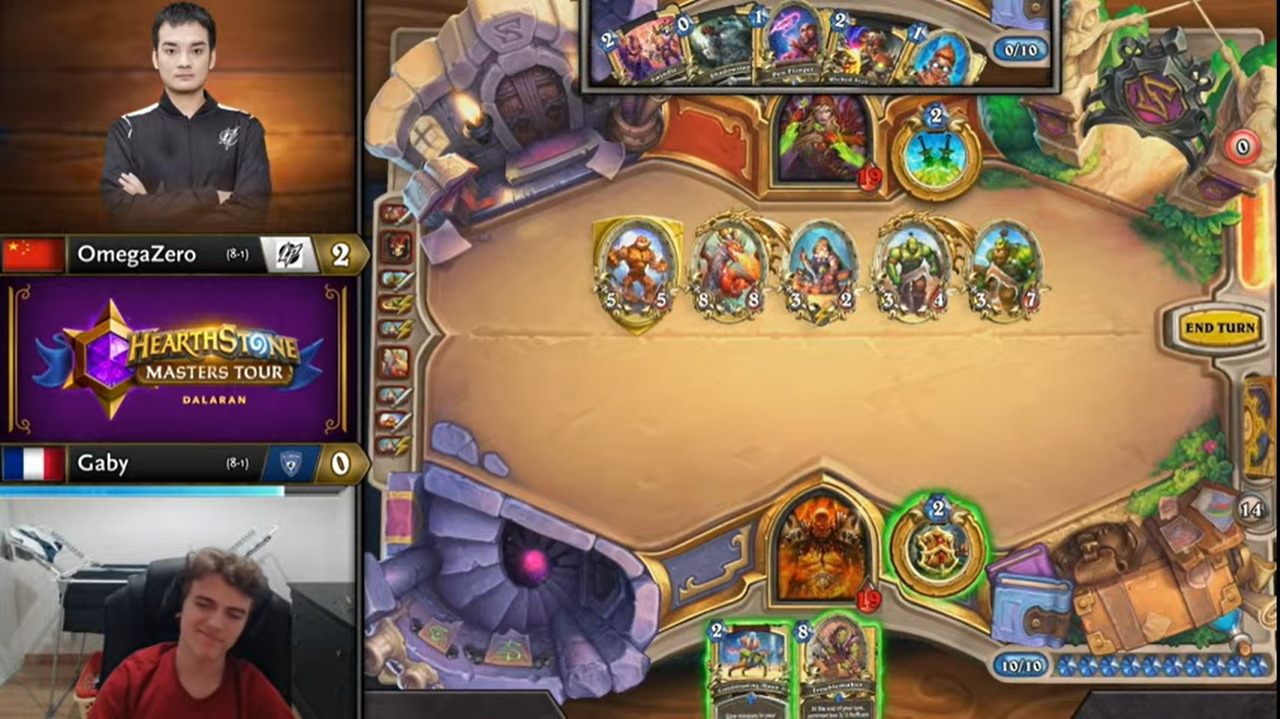 好在下个回合OmegaZero就等到了聒噪怪,一波铺出7血大场,Gaby不够费出3工匠!